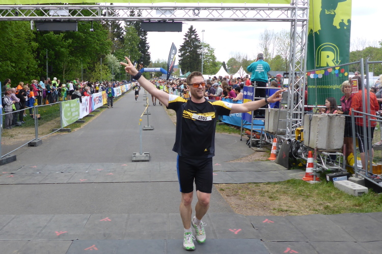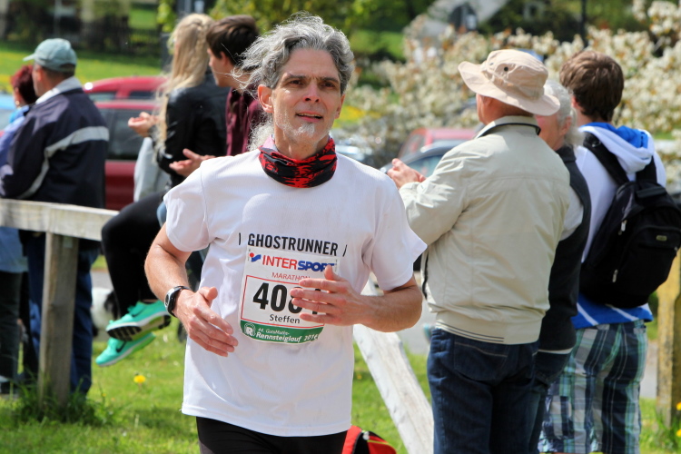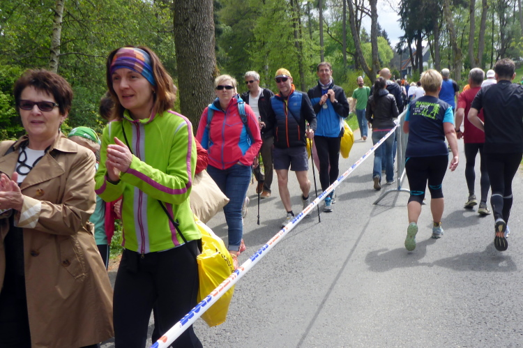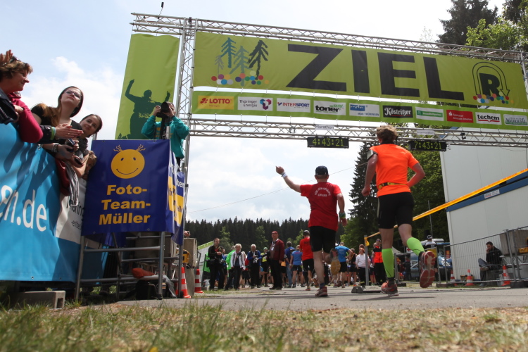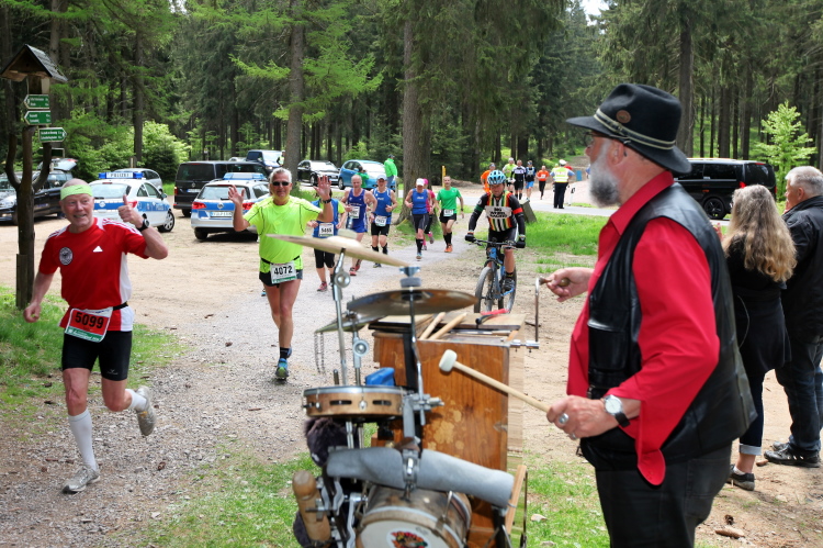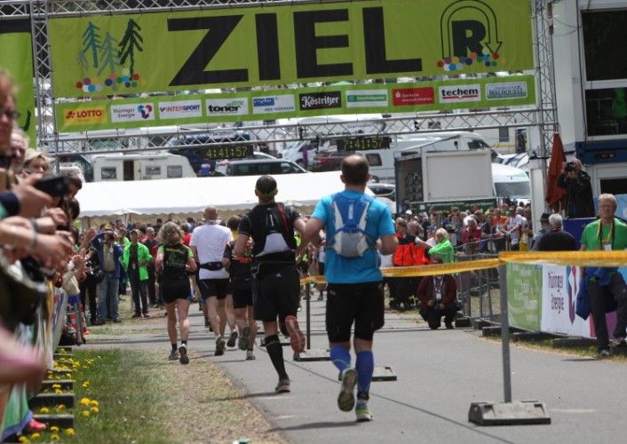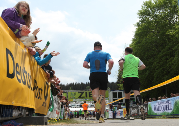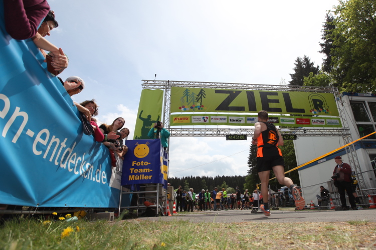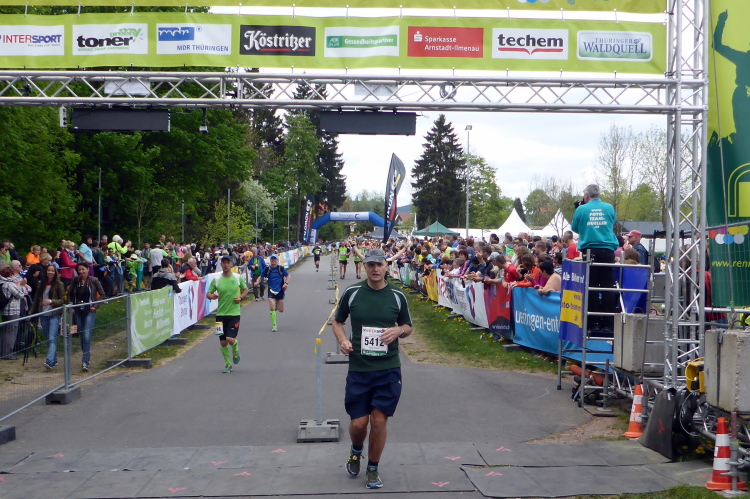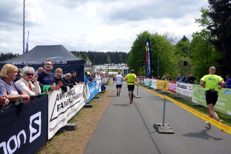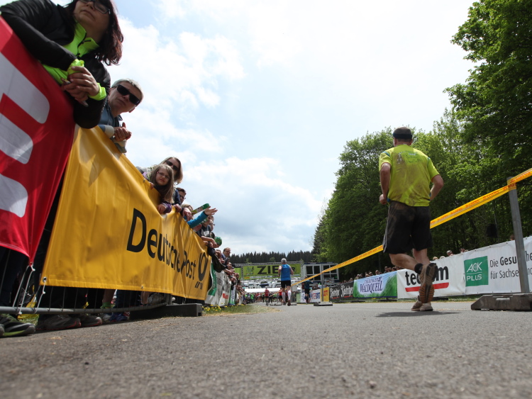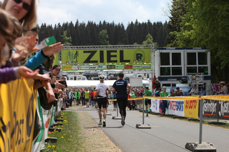 Es läuft und so erreichen wir bald Schmiedefeld. In den Ort geht es deutlich bergab und ich gebe nochmal richtig Gas. Zahlreiche Zuschauer am Straßenrand applaudieren und quetschen aus mir noch mal das letzte heraus. Dann kommt der finale Anstieg bei Kilometer 41. Hunderte Zuschauer und Finisher stehen hier und feuern uns an. Da kann und will ich nicht nachlassen. Schließlich bin ich dann doch ziemlich abgekämpft, als die abschließende Sportplatzrunde ansteht.