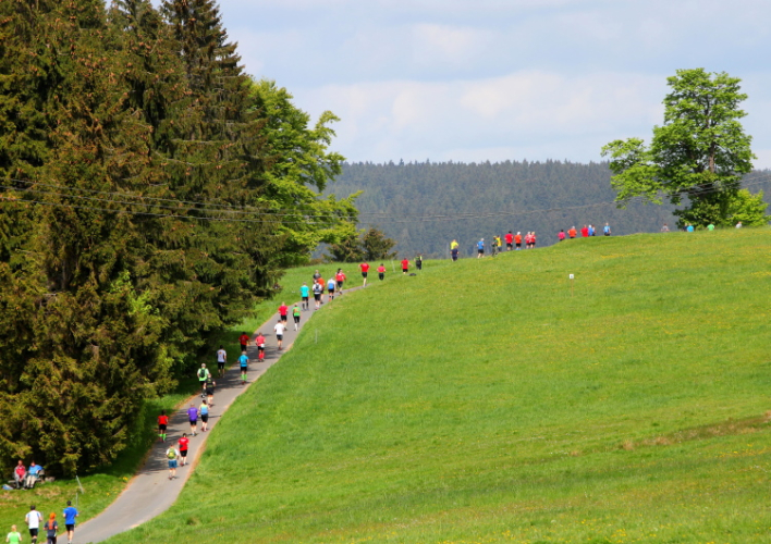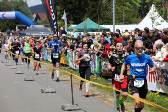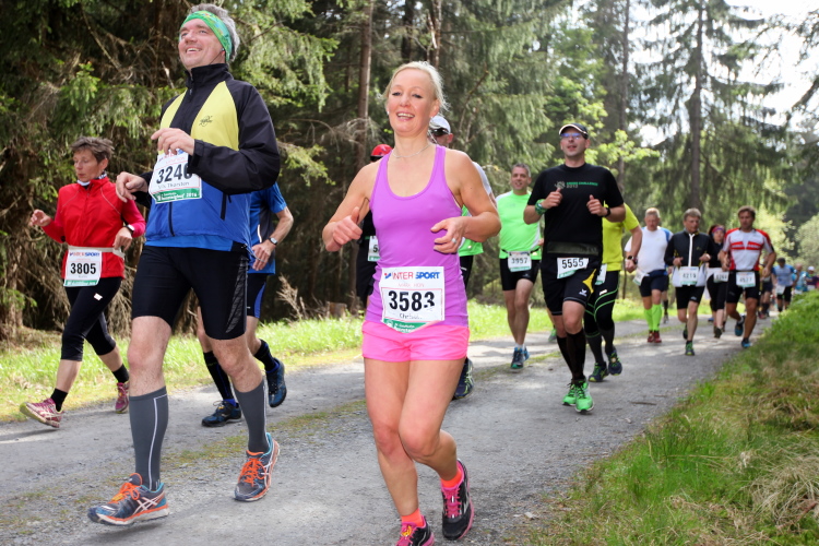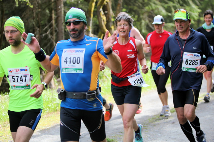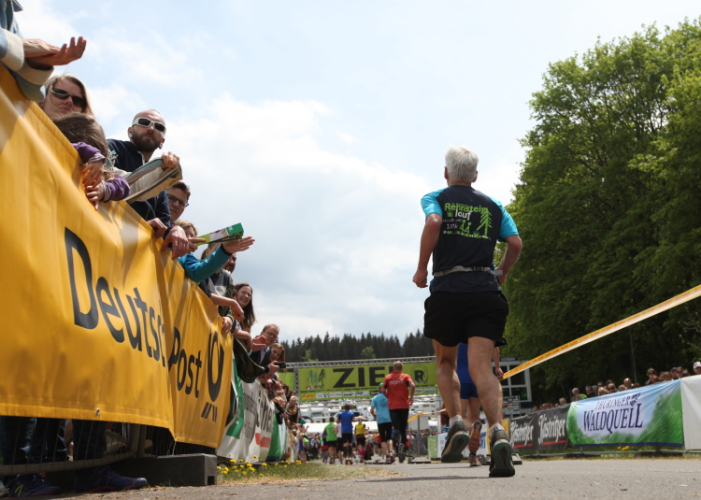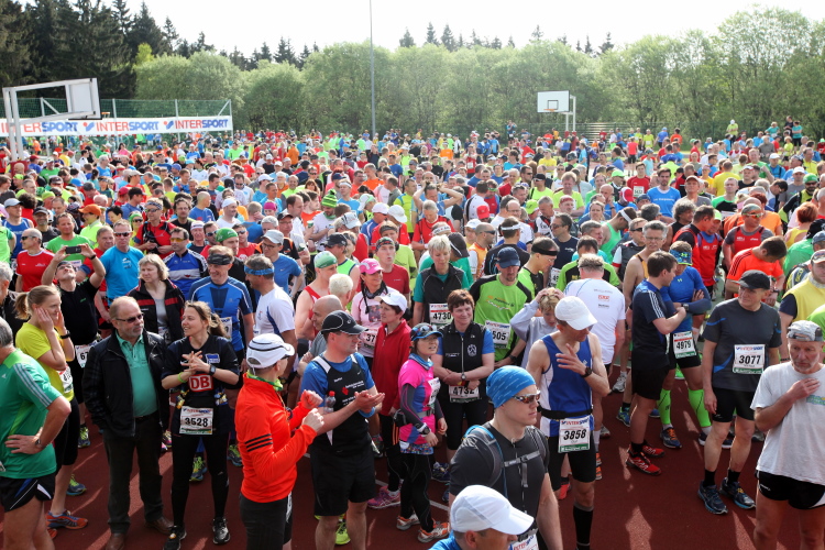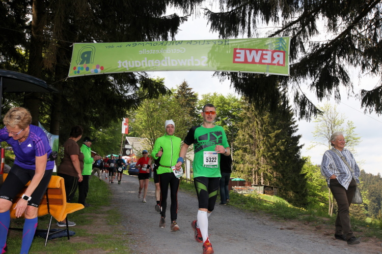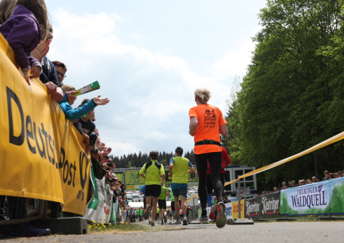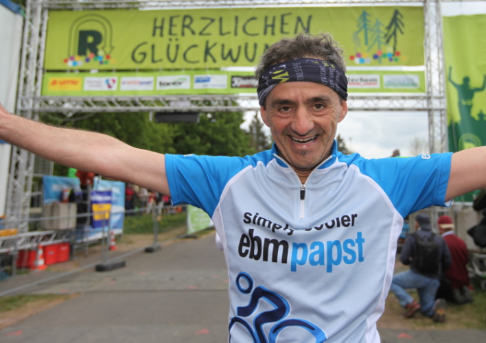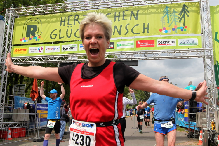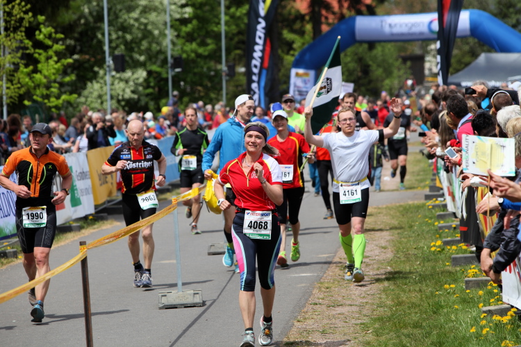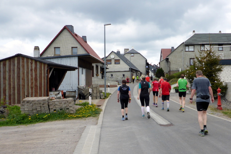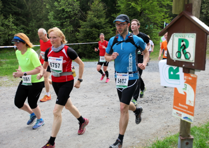 Es läuft und so erreichen wir bald Schmiedefeld. In den Ort geht es deutlich bergab und ich gebe nochmal richtig Gas. Zahlreiche Zuschauer am Straßenrand applaudieren und quetschen aus mir noch mal das letzte heraus. Dann kommt der finale Anstieg bei Kilometer 41. Hunderte Zuschauer und Finisher stehen hier und feuern uns an. Da kann und will ich nicht nachlassen. Schließlich bin ich dann doch ziemlich abgekämpft, als die abschließende Sportplatzrunde ansteht.