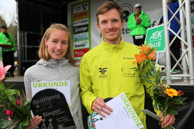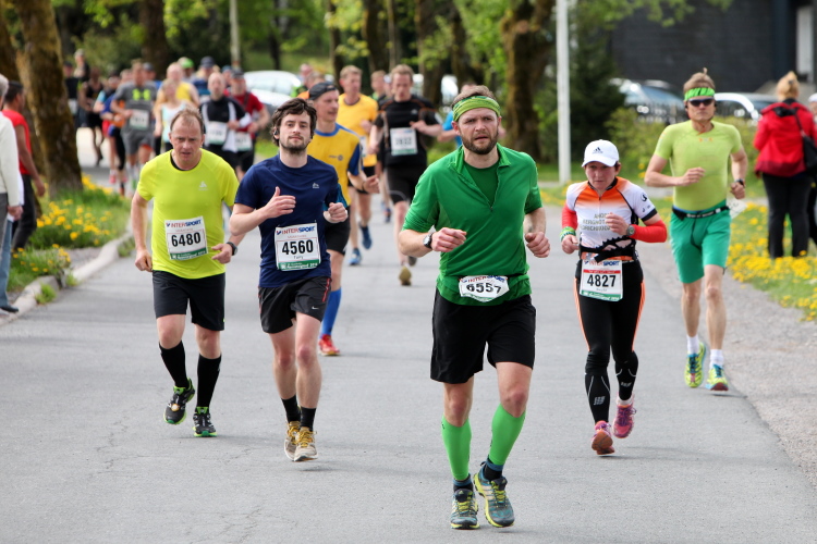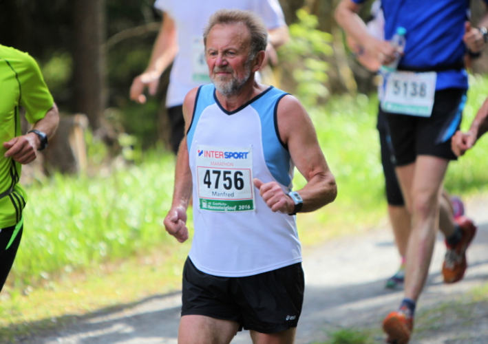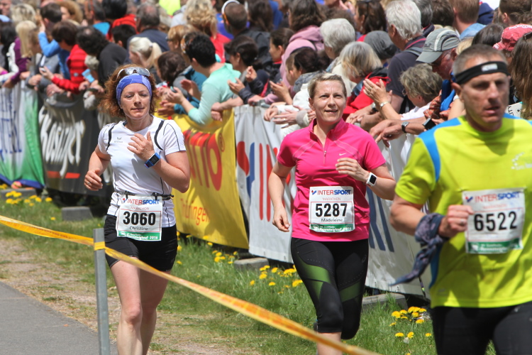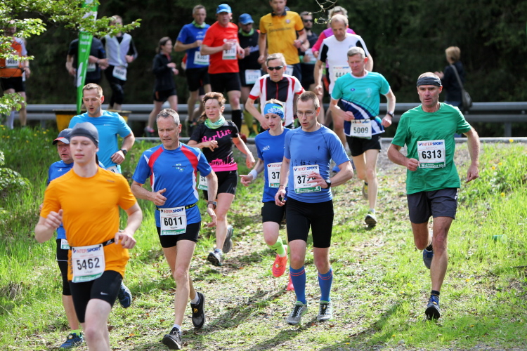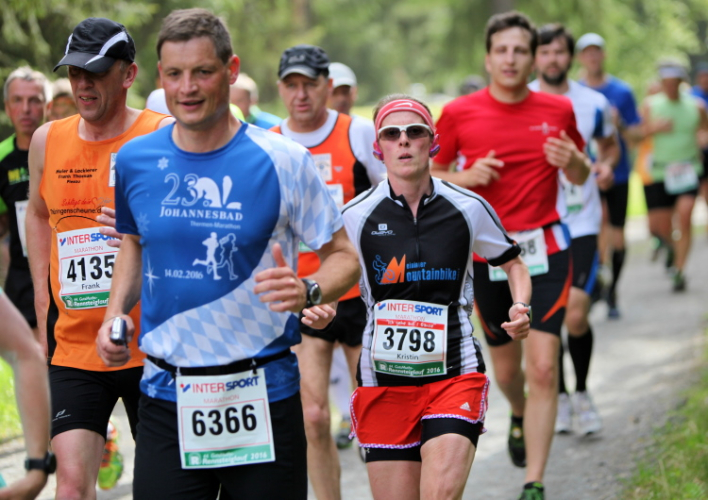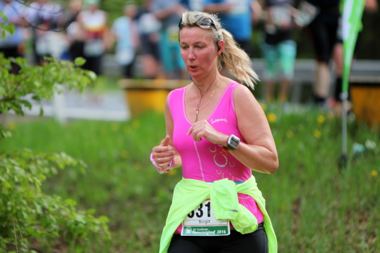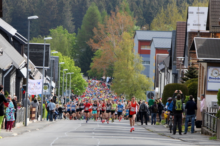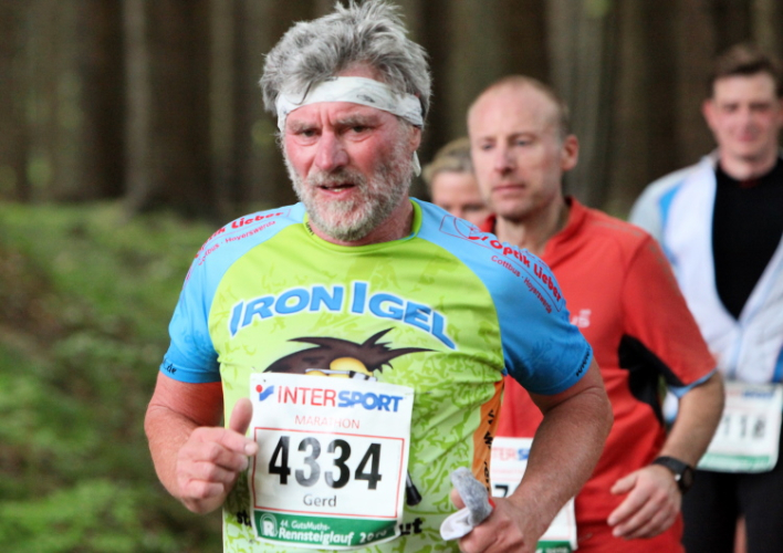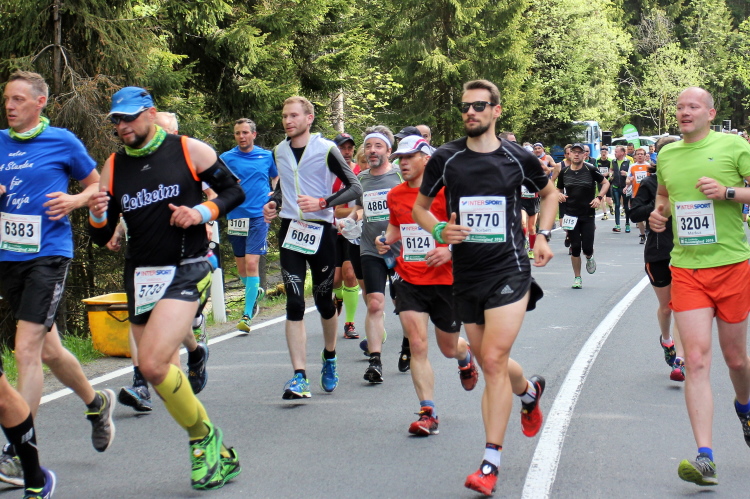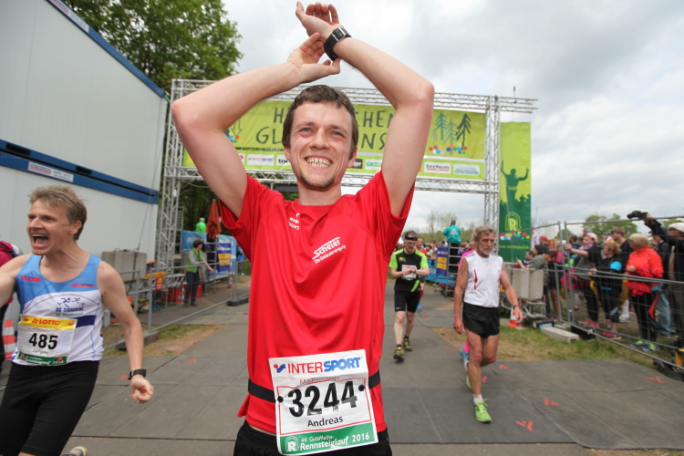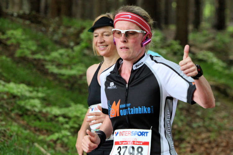 Es läuft und so erreichen wir bald Schmiedefeld. In den Ort geht es deutlich bergab und ich gebe nochmal richtig Gas. Zahlreiche Zuschauer am Straßenrand applaudieren und quetschen aus mir noch mal das letzte heraus. Dann kommt der finale Anstieg bei Kilometer 41. Hunderte Zuschauer und Finisher stehen hier und feuern uns an. Da kann und will ich nicht nachlassen. Schließlich bin ich dann doch ziemlich abgekämpft, als die abschließende Sportplatzrunde ansteht.