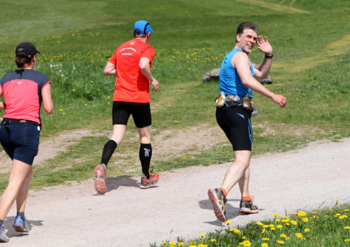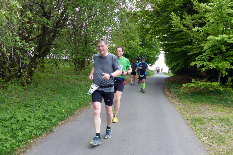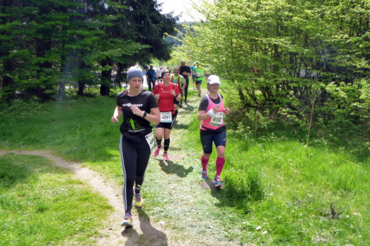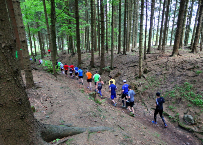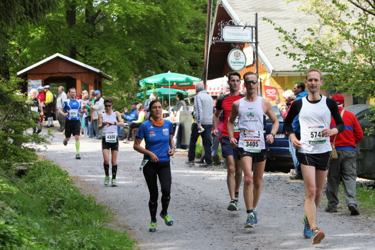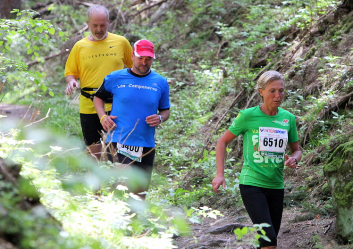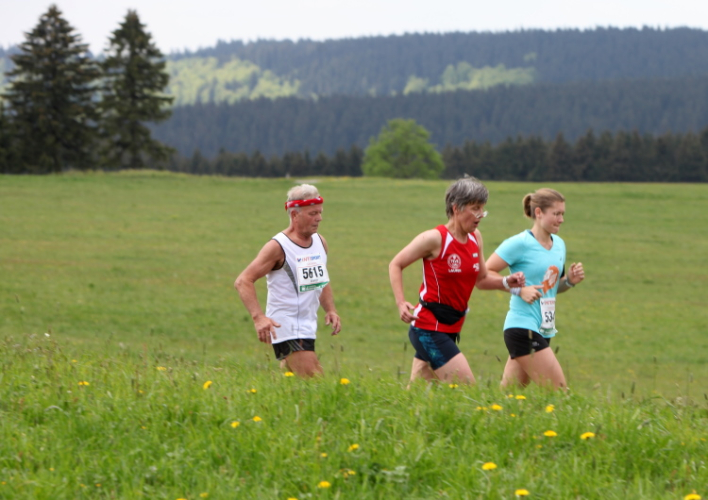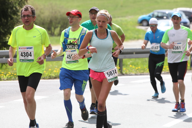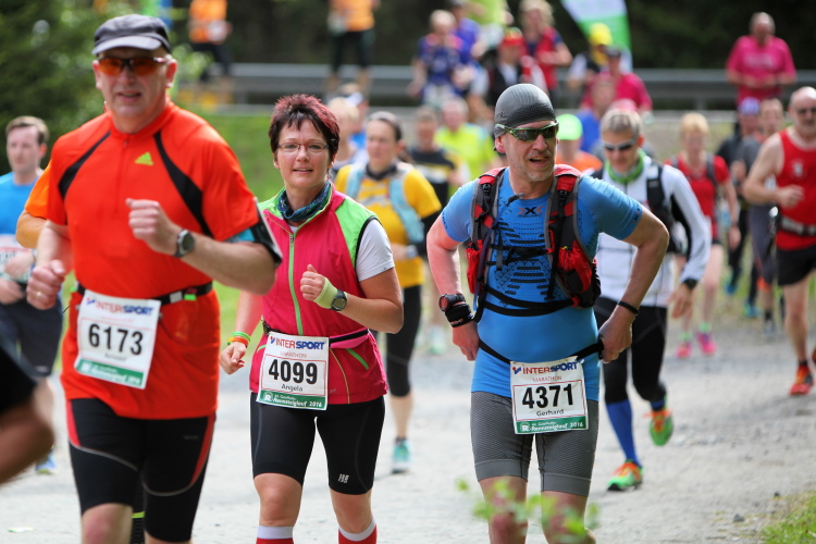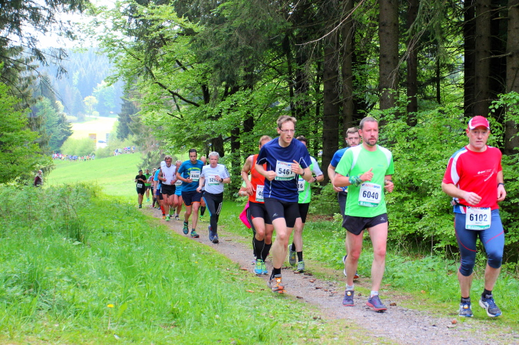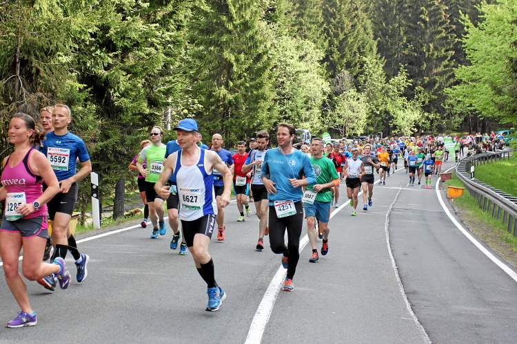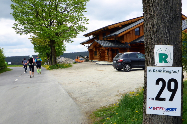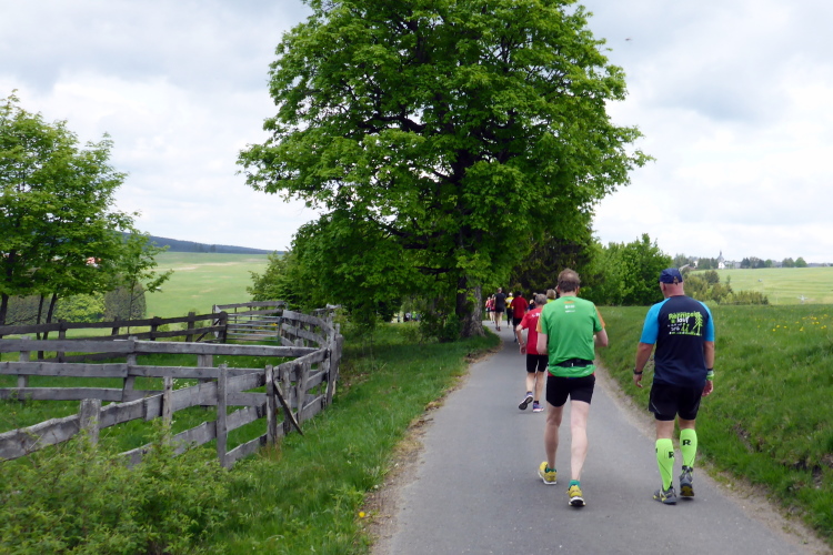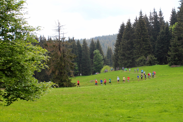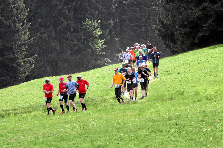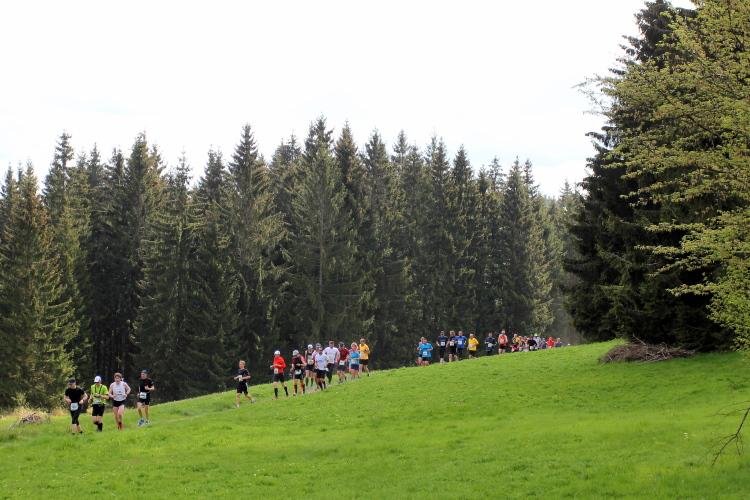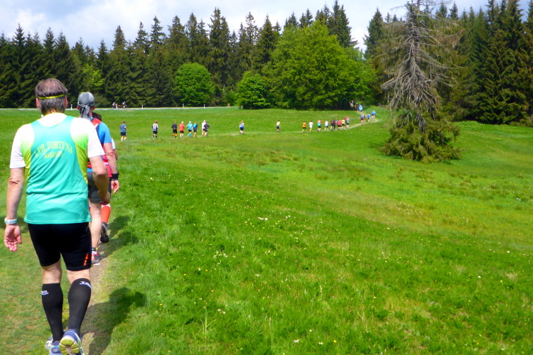 Die nächsten Kilometer verlaufen auf einer gesperrten Straße. Das Teilnehmerfeld teilt sich in Straßenläufer und Trailrunner. Die einen nehmen glatten Asphalt, die anderen den rustikalen Wiesenweg unter die Sohlen. Ich entscheide mich fürs Rustikale, ist doch viel schöner.
