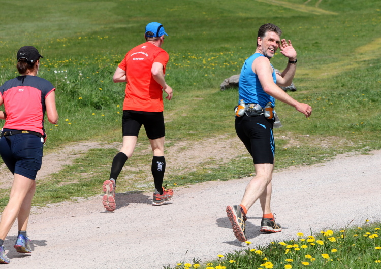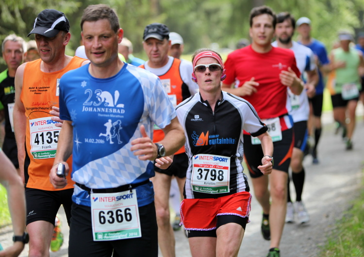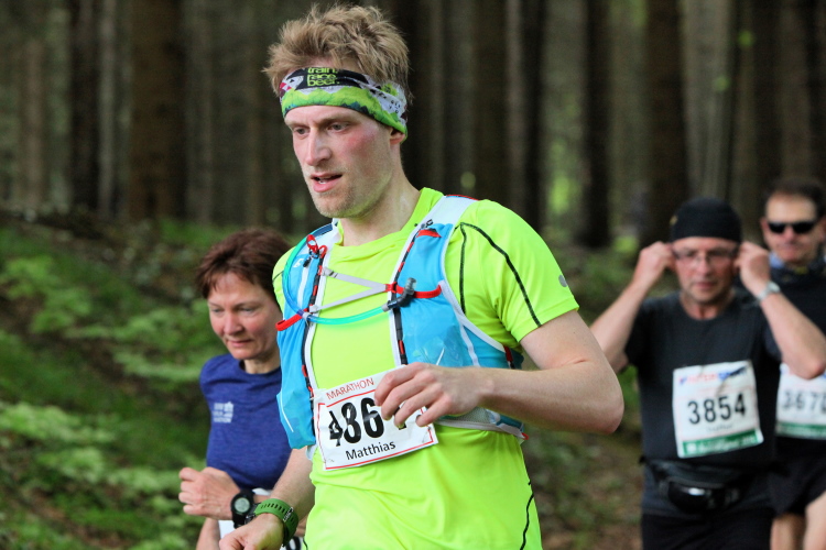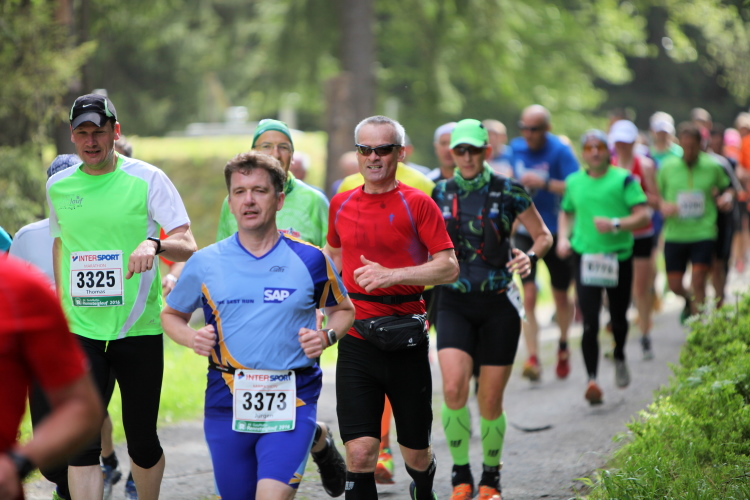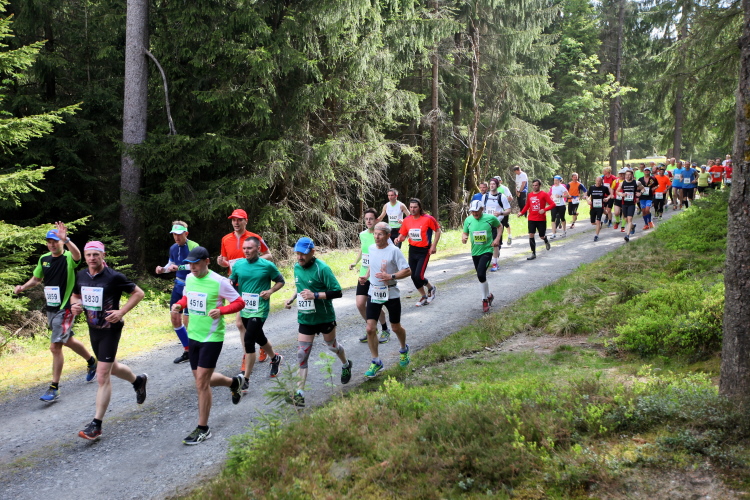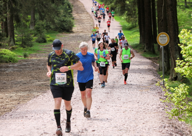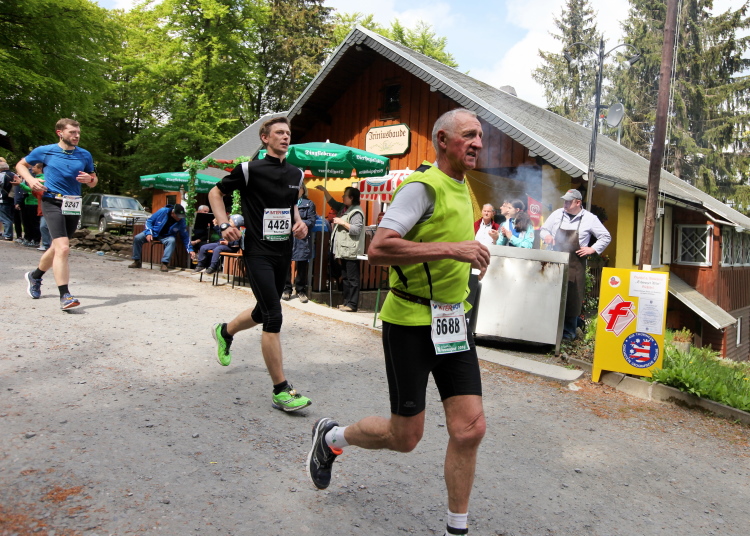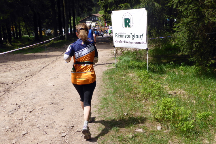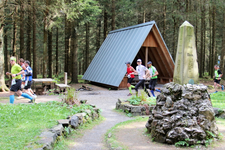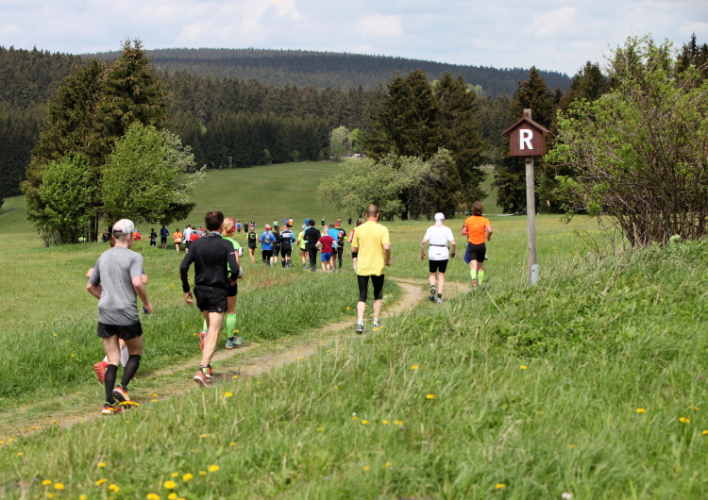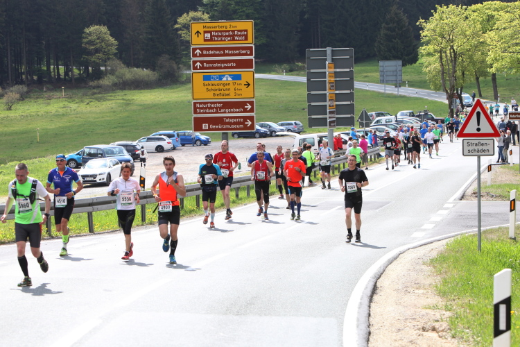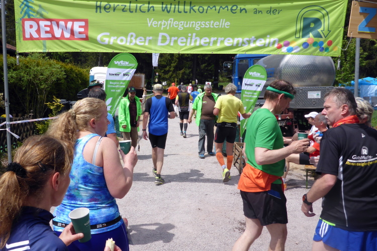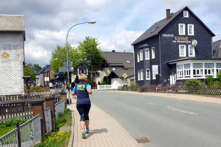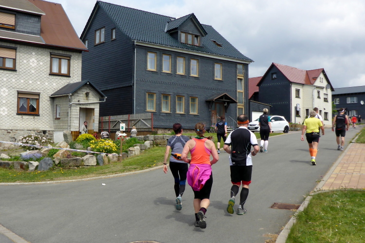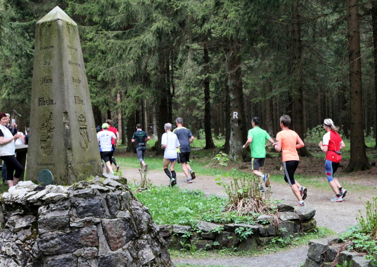 Neustadt erreichen wir bei Kilometer 28 und durchqueren die Ortschaft auf der Hauptstraße. Die zahlreichen mit grauen und schwarzen Schiefertafeln verkleideten Häuser sind vielleicht nicht jedermanns Geschmack, aber typisch für den Thüringer Wald. Am Ortsende finden wir noch eine Getränkestation, die ich nochmal dankbar in Anspruch nehme. Auf schmalen Pfaden laufen wir über Wiesen und durch Waldstücke, immer leicht wellig, aber ohne giftige Steigungen. Bei Kilometer 33,4 ist am Dreiherrenstein die nächste Verpflegungsstelle. Der Grenzstein ist einer von unglaublich vielen am Rennsteig. Irgendjemand hat sie mal gezählt und kam auf 1007. Dieser hier markiert den Grenzpunkt der Gemarkungen Masserberg, Fehrenberg und Goldisthal.