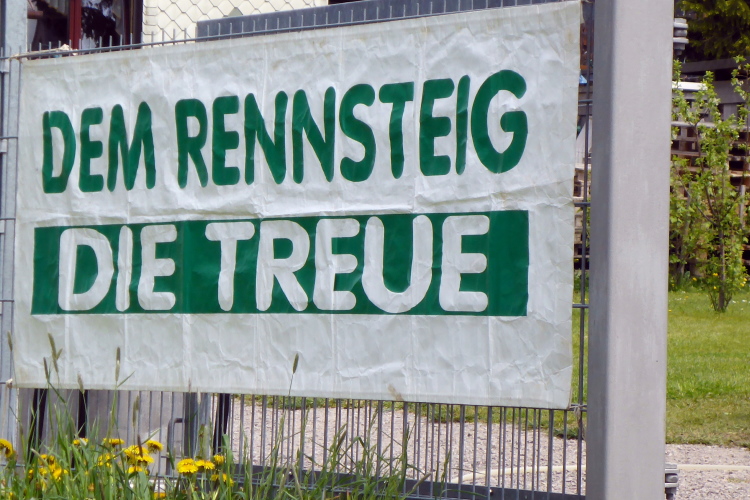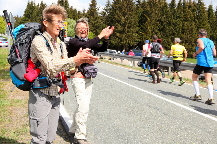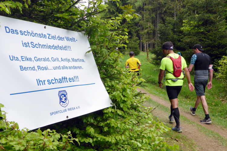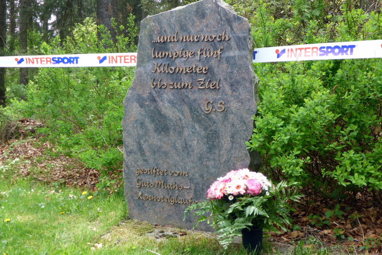 Dann ist sie erreicht, die letzte Verpflegungsstelle im Frauenwald bei Kilometer 37,1. Erstmal bekomme ich einen Wanderstempel auf die Hand gedrückt, dann erst geht’s zum Bier. So gestärkt dürften die letzten fünf Kilometer kein Problem sein. Ein Gedenkstein spricht gar von „lumpigen Kilometern“. Na dann. Einerseits bin ich froh, bald im Ziel zu sein, anderseits aber auch etwas wehmütig. So groß ist der Spaß auf der Strecke. Auf den letzten Kilometern gibt es Plakate und Schilder mit motivierenden Sprüchen. Danke, gut gemeint, aber ich habe das heute nicht nötig.