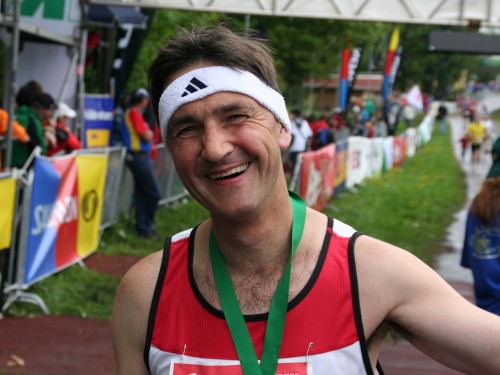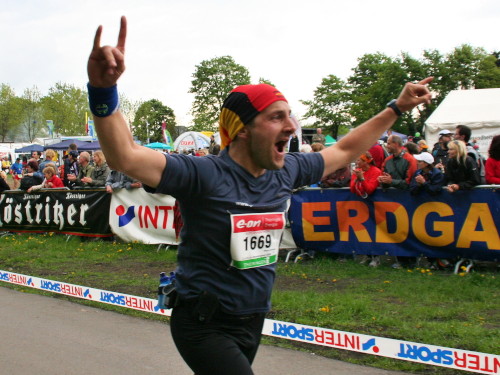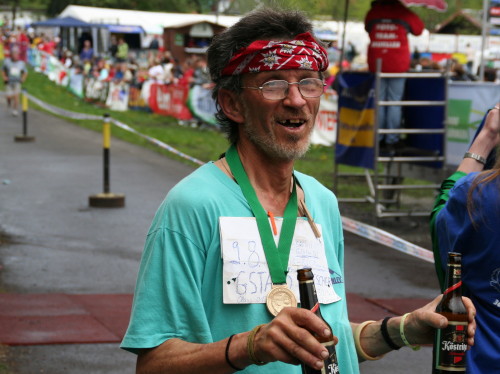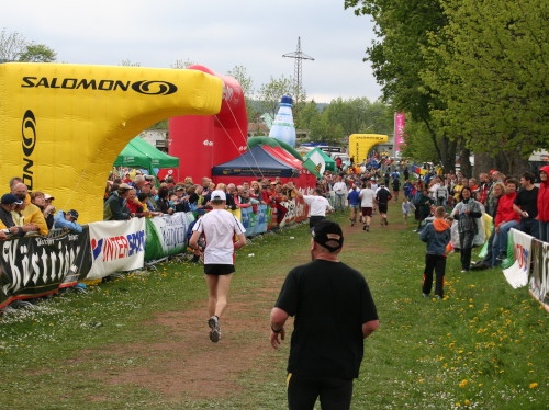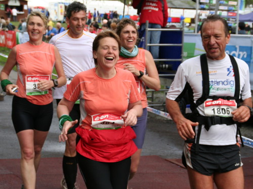 Wer endlich keuchend oben ankommt, traut seinen Augen nicht. Von der Wiese, Entschuldigung, vom Sportplatzrasen ist vor lauter Menschen kaum was zu sehen. Nur die riesigen Werbeträger der Sponsoren ragen aus der Menge heraus. Rustikal wie die ganze Strecke sind auch die letzten 400 Meter. Ein breiter Wiesenpfad ist für die Läuferinnen und Läufer rund um den Sportplatz frei gesperrt, rechts und links massig Zuschauer. Vor der Zielgeraden wird separiert: Marathonis linke Seite, Supermarathonis rechts. So geht es unter ohrenbetäubenden Lärm ins Ziel. Obwohl sich Sprecherin und Sprecher abwechseln, kommen sie kaum nach, alle Finisher namentlich zu begrüßen. Sie kennen halt viele Stammläufer und ihre Geschichte, die sie dem Publikum nicht vorenthalten wollen. Die Kulisse ist grandios, die Atmosphäre unvergleichlich, handgemacht, wie der ganze Lauf. Ich sehe etliche Tränchen fließen.