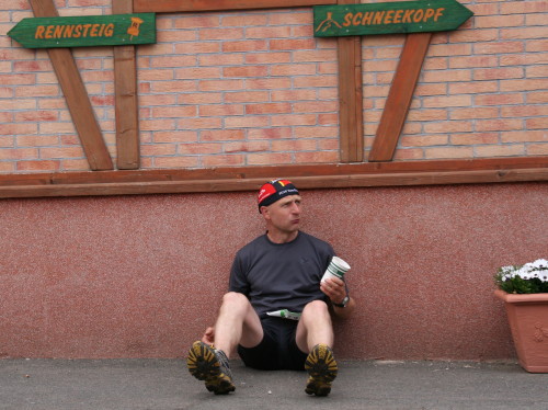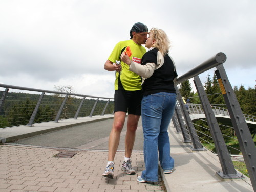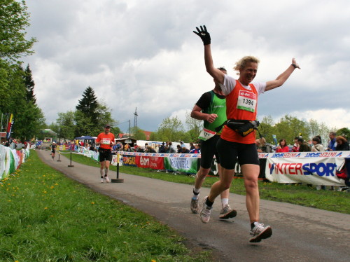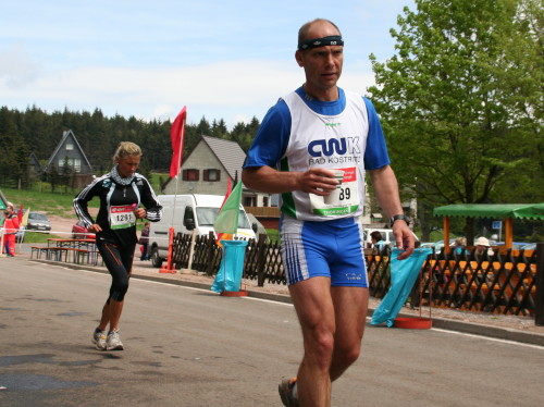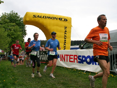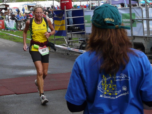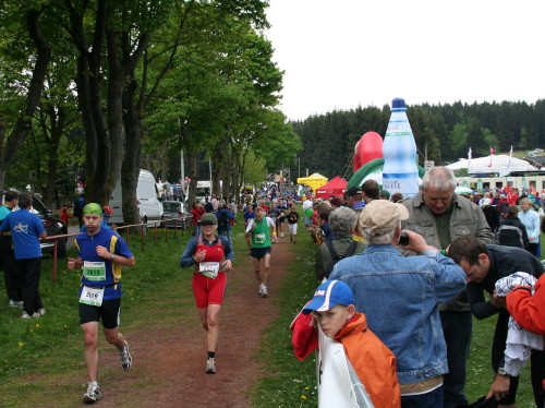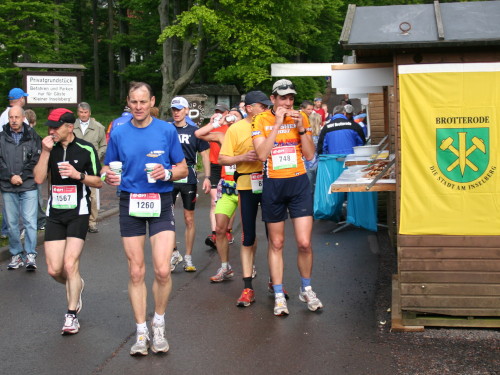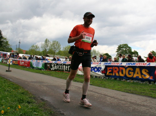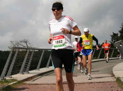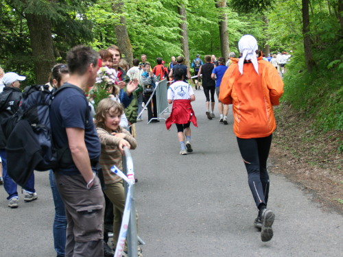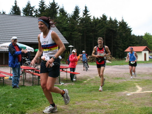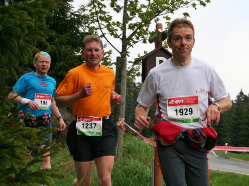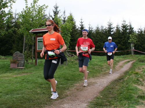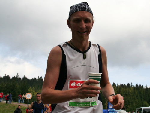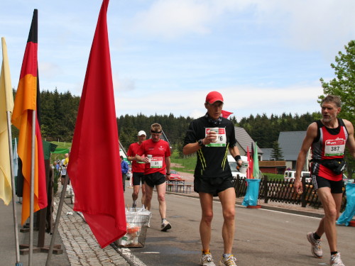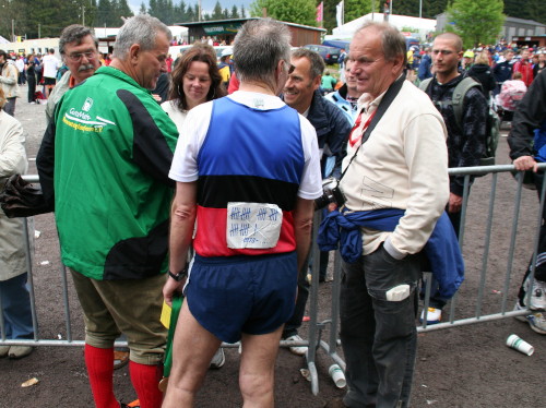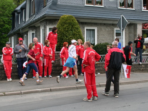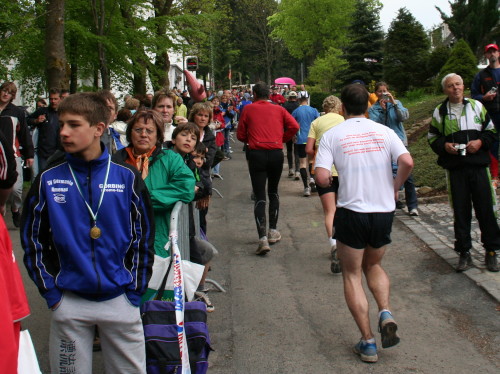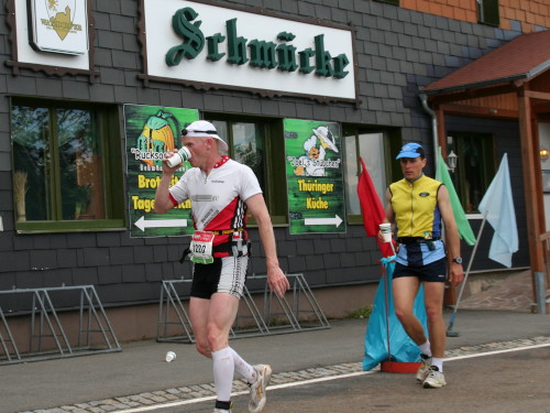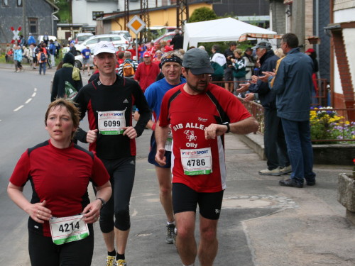 Den Einheimischen sind aber nicht nur die Euros willkommen, sondern auch die Menschen. Gerne und begeistert geben sie zurück, was nichts kostet und doch so gut ankommt. Und so beklatschen sie an jeder Straßenquerung die Läuferinnen und Läufer. An den Verpflegungsstellen, insbesondere an der Ebertswiese oder beim Grenzadler geht es zu, wie auf einem Volksfest. Und die Situation in Schmiedefeld habe ich ja bereits mit Woodstock verglichen. Die Marathonis werden schon unten in der Bahnhofstraße von unzähligen Zuschauern in Empfang genommen und den letzten Anstieg zum Sportplatz förmlich hinauf gebrüllt. Wehe dem der meint, er könne zum Marschierer werden. Dem machen gleich hundertfache Zurufe Beine. Zum Glück hat man die Laufstrecke mit Gittern abgesperrt. Sonst würde man die armen Teufel hoch schubsen.