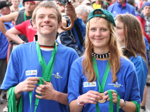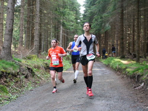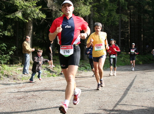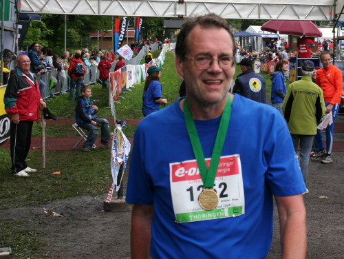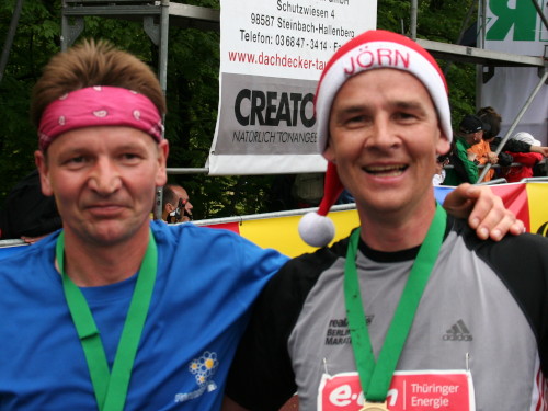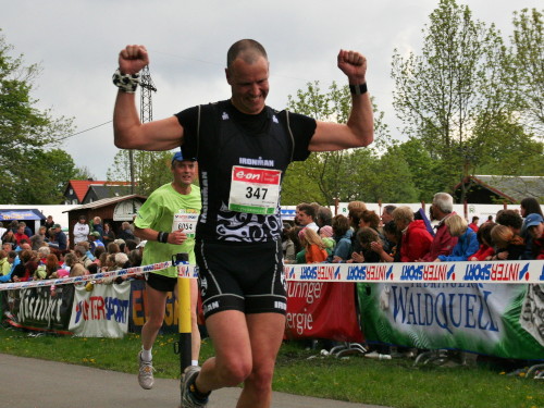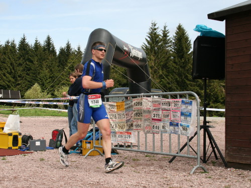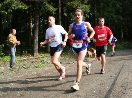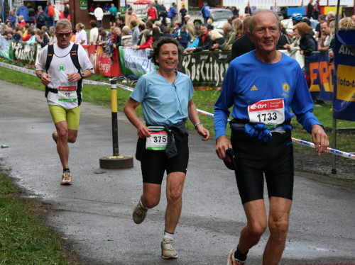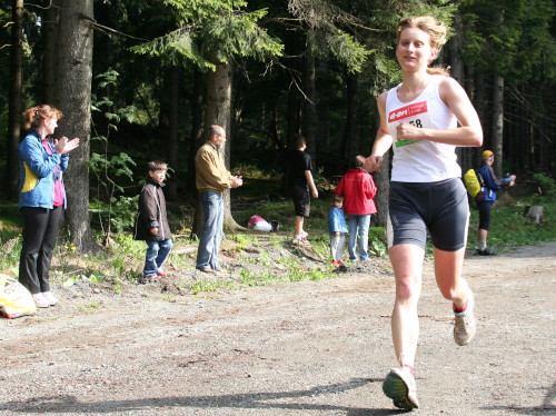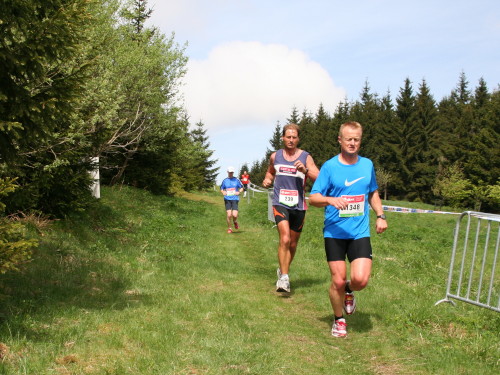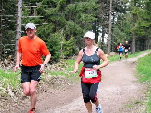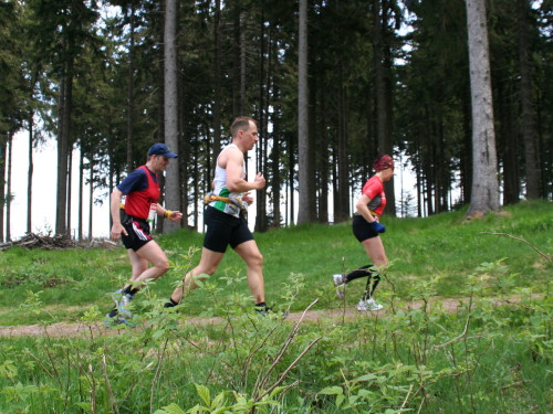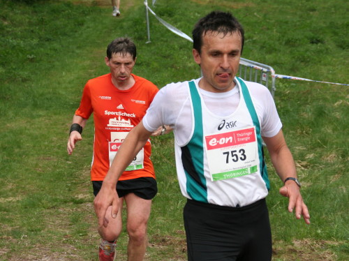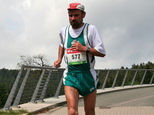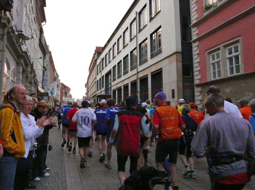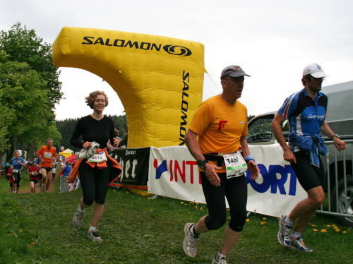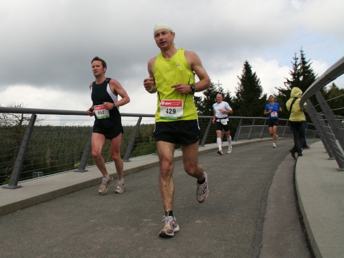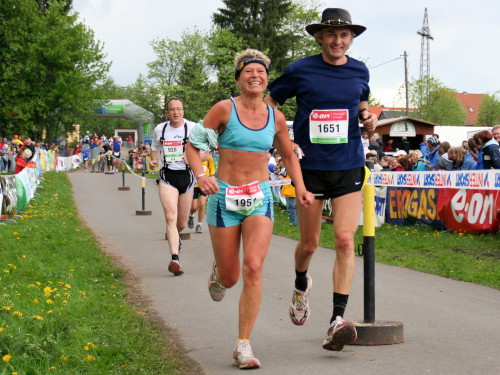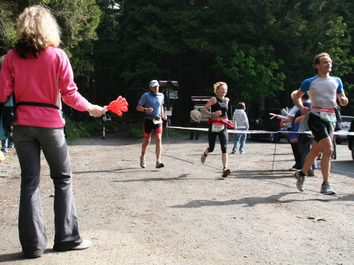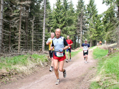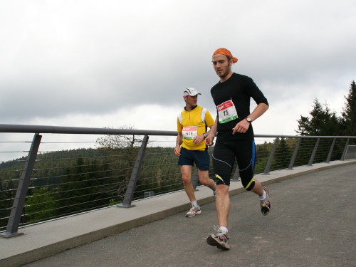 Den Einheimischen sind aber nicht nur die Euros willkommen, sondern auch die Menschen. Gerne und begeistert geben sie zurück, was nichts kostet und doch so gut ankommt. Und so beklatschen sie an jeder Straßenquerung die Läuferinnen und Läufer. An den Verpflegungsstellen, insbesondere an der Ebertswiese oder beim Grenzadler geht es zu, wie auf einem Volksfest. Und die Situation in Schmiedefeld habe ich ja bereits mit Woodstock verglichen. Die Marathonis werden schon unten in der Bahnhofstraße von unzähligen Zuschauern in Empfang genommen und den letzten Anstieg zum Sportplatz förmlich hinauf gebrüllt. Wehe dem der meint, er könne zum Marschierer werden. Dem machen gleich hundertfache Zurufe Beine. Zum Glück hat man die Laufstrecke mit Gittern abgesperrt. Sonst würde man die armen Teufel hoch schubsen.