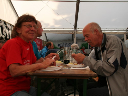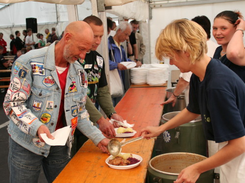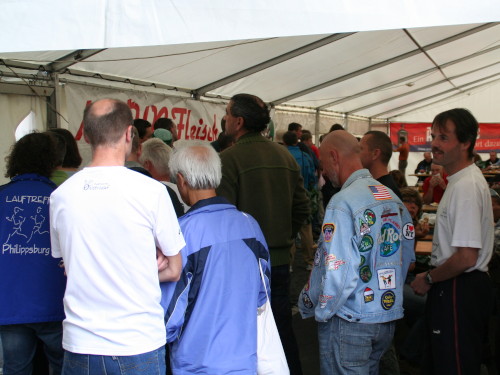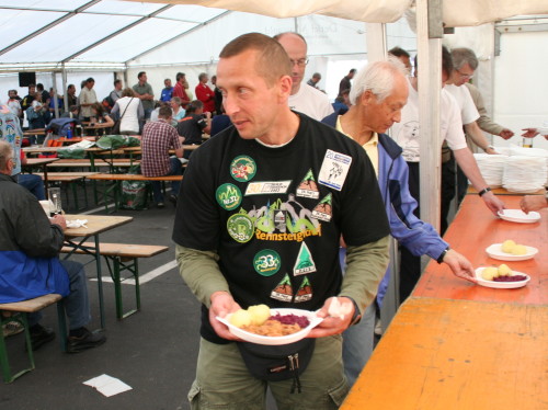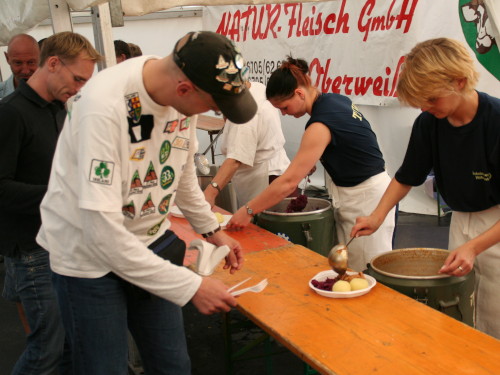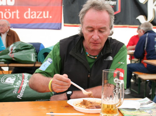 Zwei Gulaschkanonen sind eingeplant. Für 1800 Läuferinnen und Läufer zu wenig. Tatsächlich steht aber nur eine zur Verfügung. Die zweite wurde kurzfristig zu einer Katastrophenübung in die Tschechei einberufen. „Jetzt haben wir hier eine Katastrophe“, meint der Sprecher und bittet um Verständnis. Völlig überflüssig. Keiner in der endlosen Warteschlange ist am Meckern. Aber auch die Mädels an den Kloß-, Fleisch- und Krauttöpfen verrichten ihren Job klaglos.
