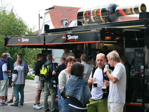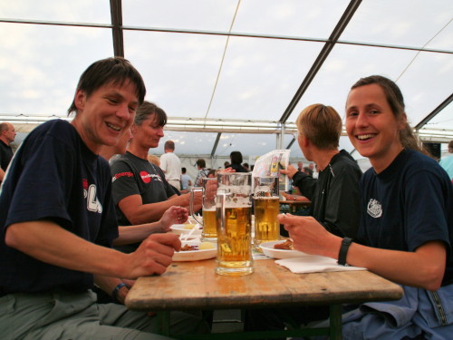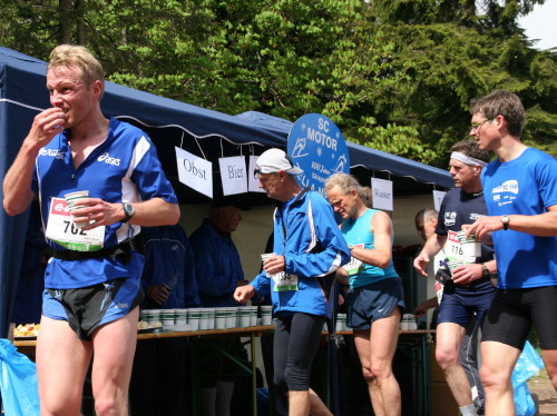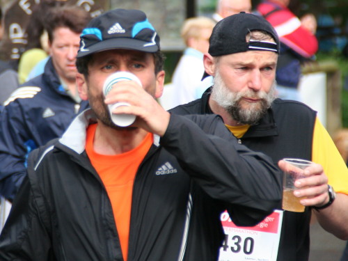 Klar, es gibt auch Obst, Wasser, Isotonisches und Cola. Aber am Besten passt zu der deftigen Kost halt Bier – und so ist der Gerstensaft an manchen Verpflegungsstellen ebenfalls im Angebot.
