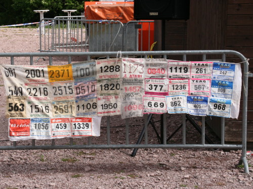 Etwas unterhalb des Sportplatzes hinter ein paar Bäumen ist noch einmal eine Wiese. Nicht so groß wie der Sportplatz, aber ausreichend um dort 11.000 Kleiderbeutel zu lagern. Weil die dem Wetter genau so ausgesetzt sind wie die Läufer, sind bei Regen die Wechselklamotten auch genau so nass. Es sei denn, man hat schon einmal eine solche Erfahrung gemacht und verpackt die Klamotten erst wasserdicht und gibt sie dann in den Beutel. Ich erwähne das deshalb, weil ich vor zwei Jahren für einen solchen Hinweis sehr dankbar gewesen wäre.