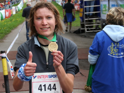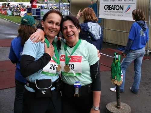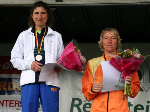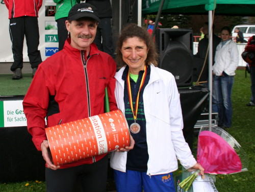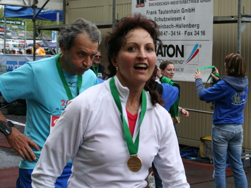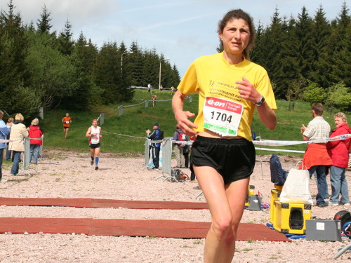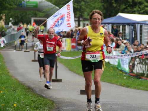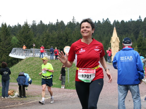 Ich habe geglaubt, diesen Bericht zu Ende zu bringen, ohne einen einzigen Namen zu erwähnen. Geht nicht – an dieser Stelle muss ich Birgit Lennartz erwähnen. Das Lauf-Phänomen aus dem Bergischen wird in Wikipedia zwar als „ehemalige“ deutsche Marathon- und Ultraläuferin bezeichnet, in der Praxis sieht das aber so aus, dass sie am Samstag mit deutlichem Vorsprung in 6:32:38 Stunden zum 8 x den Rennsteig-Supermarathon gewinnt. Ihre Siegesliste macht einem schwindelig: 7 x Biel, 10 x Swiss Alpine, 6 x Defi Val Traverse. Dazu an die 60 Marathonsiege. Ihre Bestzeit über 100 km (7:18:57 Stunden) ist noch heute Deutscher Rekord.