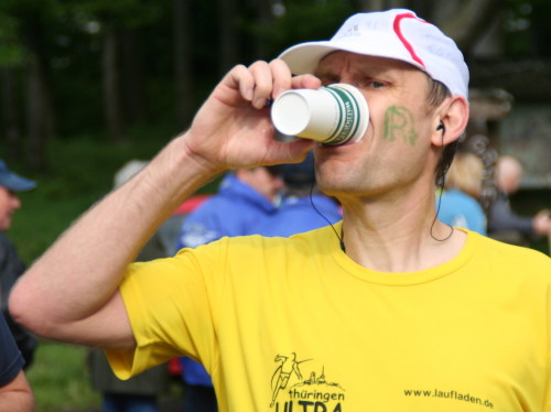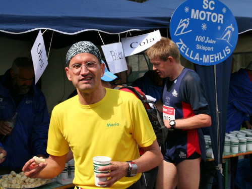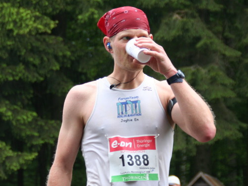 Undenkbar, dass man einem Rennsteigläufer unterwegs Riegel, Gel oder anderes „künstliches Zeugs“ zumutet. Schwärmt der Teilnehmer von der sagenhaften Verpflegung, meint er Wurst- und Schmalzbrote, Brühe und Schleim. Schleim? Igitt. Dachte ich bei meinem ersten Kontakt mit dem „Rennsteig-Zaubertrank“ auch. Aber erstens ist nur der Name „eklig“ und zweitens zeigt er Wirkung - getreu dem Grundsatz: Was gut ist muss nicht schmecken. Obwohl, nach dem Geschmacks-Tuning mit Heidelbeeren kann man auch darüber nicht mehr meckern.