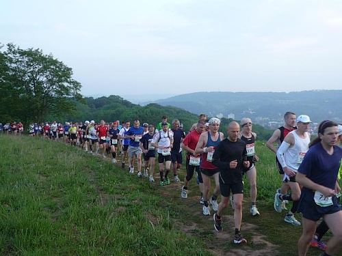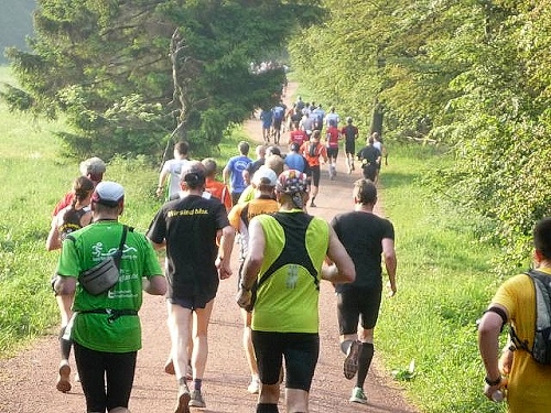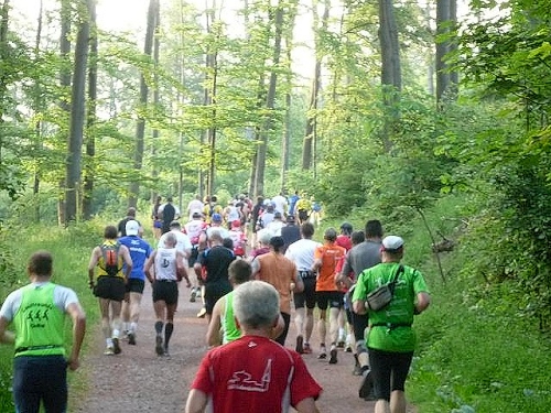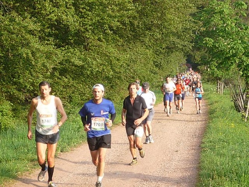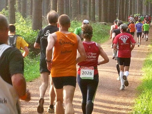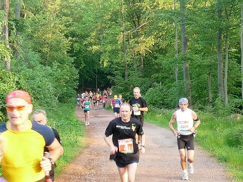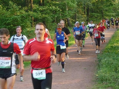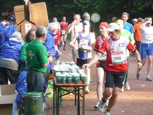 Nur kurz gibt der Wald einen Blick frei auf die unter uns liegenden Randbezirke von Eisenach. Und schon tauchen wir wieder in den dichten Laubwald ein. Mal rauf, mal runter geht es den weichen Naturweg entlang. Die Orientierung habe ich schnell verloren. Aber was soll’s: Frisch ist die Morgenluft, frisch ist das Grün um uns herum, und frisch sind auch wir noch - ein einziger Laufgenuss. Am Waldsportplatz bei km 6,9 gibt es erstmals Gelegenheit, die Flüssigkeitsreserven aufzustocken. Doch richtig Durst haben erst wenige.