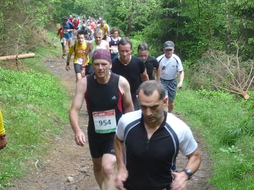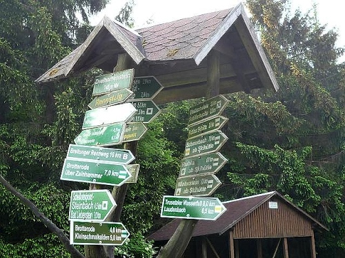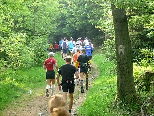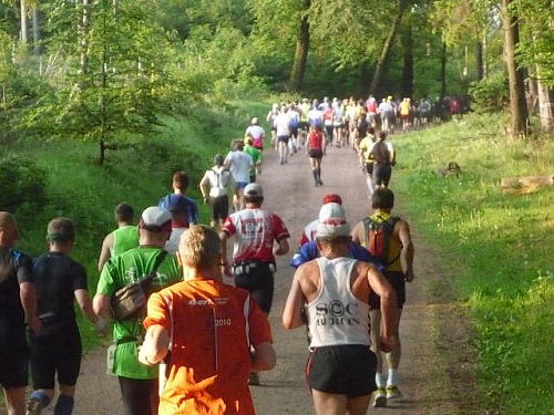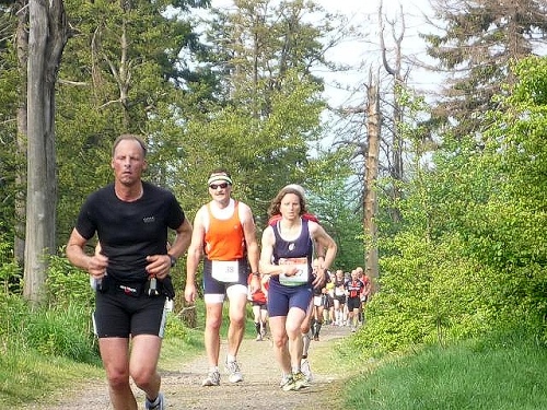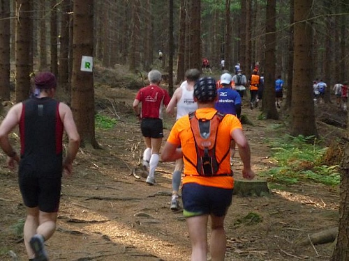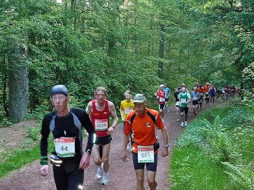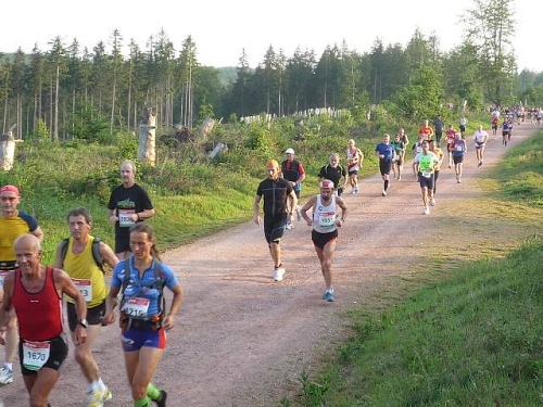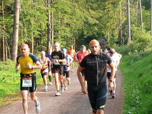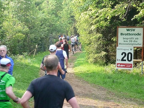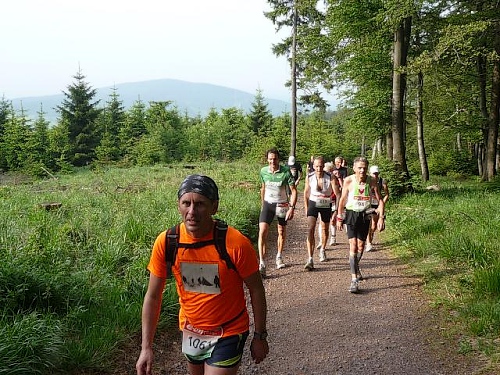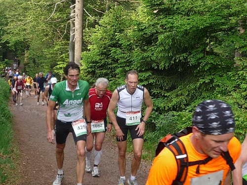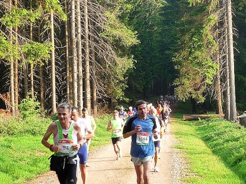 Auf den verbleibenden gut 71 km ist nun die Natur, genauer gesagt der Wald in all seinen Facetten, das beherrschende Element unseres Laufs. Die nächste Ansiedelung, die diesen Namen verdient, werde ich erst wieder im Ziel sehen. Daran, dass der Rennsteiglauf nicht nur ein Naturerlebnis ist, sondern auch durch ein Mittelgebirge führt, werden wir von Anfang an nachdrücklich erinnert: Kräftige Steigungen lassen uns schnell an Höhe gewinnen. Aber die nehmen fast alle im Moment noch ganz locker.