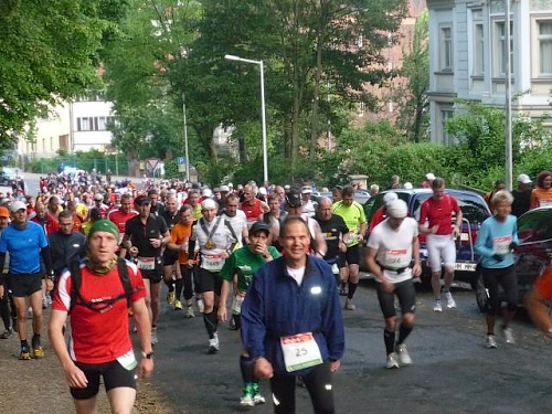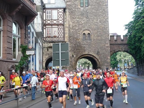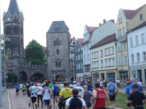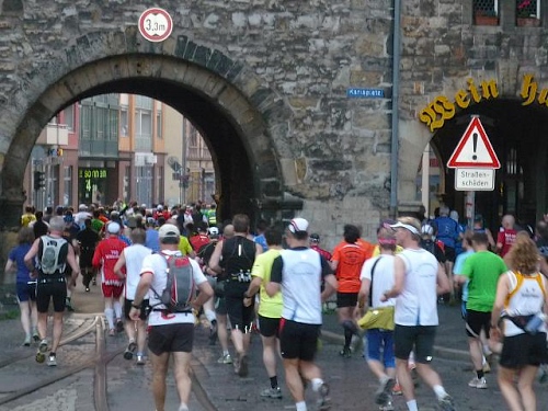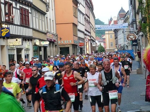 Wie in einen Flaschenhals drängen die Läufer vom weiten Rund des Marktplatzes in die vergleichsweise enge Karlsstraße. Aber es geht ausgesprochen gesittet zu, denn jeder weiß: Hier wird das Rennen nicht entschieden. Nur ein paar Hundert Meter lang klappern die Schritte über das Pflaster der Eisenacher Flaniermeile, füllen die Fußgängerzone für wenige Minuten mit prallem Leben - dann ist der Spuk vorbei. Vorbei am Lutherdenkmal geht es durch das wuchtige Nikolaitor, ein Relikt der mittelalterlichen Stadtbefestigung. Gleich dahinter: Eine scharfe Rechtskurve und schon zieht sich die Straße in langen Serpentinen beständig den Hang hinauf, hinein in den Eisenacher Stadtwald, der den Läuferstrom verschluckt und Eisenach die morgendliche Ruhe zurück gibt.