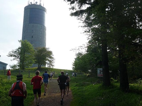 Der 916 m hohe Große Inselsberg ist eine der höchsten Erhebungen des Thüringer Waldes und bei km 25,5 der zweithöchste Punkt unserer Laufstrecke. Im Vergleich zu Alpengipfeln ist er zwar nur ein Berglein. Wenn man ihn läuferisch erobern muss, sieht man den Gipfelsturm aber doch mit etwas anderen Augen. Er ist zudem die einzige Erhebung entlang der Strecke, die rein optisch auch als Berg wahrnehmbar ist, fast schon so etwas wie eine Berginsel im Hügelmeer. Die Aussicht von oben ist so gut, dass hier gleich zwei Berggasthöfe ihr Auskommen finden. Leider trübt der leicht diesige Himmel die Sicht ein wenig. Die exponierte Lage des Gipfels nutzen aber auch andere. Allerdings sind die alles überragenden Radio- und TV-Sendetürme optisch nicht unbedingt das, was man mit Gipfelidylle in Verbindung bringt.