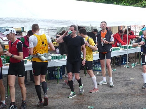 Nach einer weiteren Getränkestation bei km 12,5 erwartet uns auf der Glasbachwiese bei km 18 die erste Verpflegungsstelle mit klassischer Rennsteigverköstigung. Aber dazu noch später.