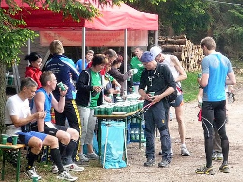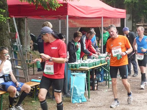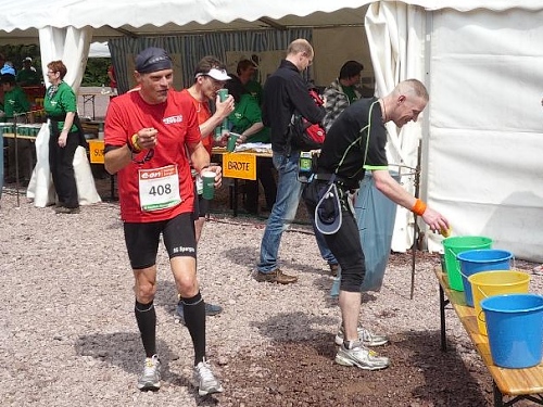 Dass es Petrus sich kurz darauf doch anders überlegt und uns mit heftigem Donnergrollen und einem nicht minder heftigen Regenguss empfängt, stört da nicht mehr wirklich, zumal es weiterhin keineswegs kalt ist. Die Verpflegungsstelle "Schmücke" bei km 64 offeriert ein letztes Mal deftige Kost, dann können wir langsam an den Endspurt denken. Eigentlich hatte ich vor, den letzten Streckenabschnitt mit einem Becher Köstritzer einzuläuten, ziehe aber dann doch eine Cola, hier stilecht in Form von “Vita-Cola” kredenzt, als Energieschub vor. Ein paar fiese kleine Steigungen folgen noch, doch gelingt es mir wie auch den meisten anderen Läufern um mich herum, auf diesen letzten Kilometer noch einmal so richtig ins Laufen zu kommen.