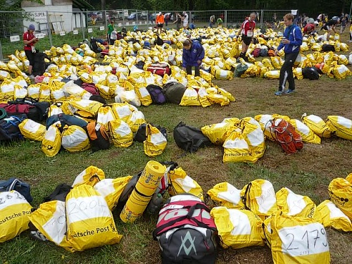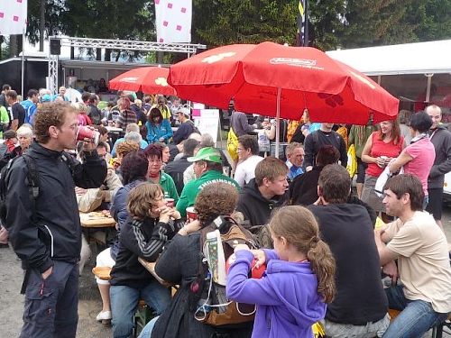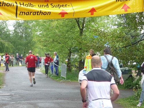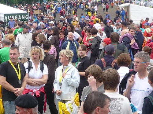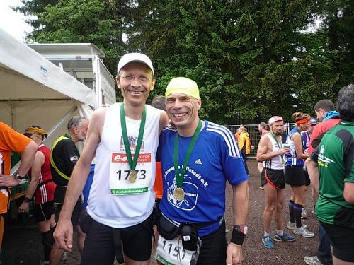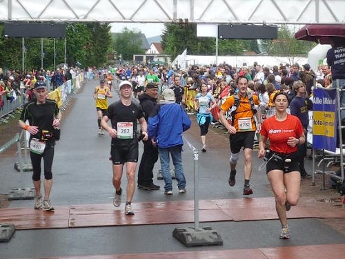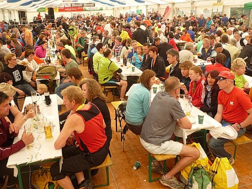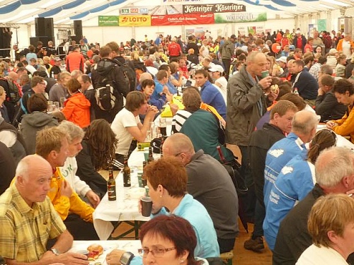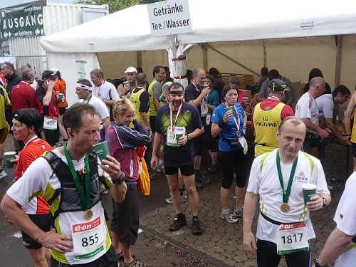 Ein dichtes Zuschauerband begleitet uns auf den letzten Metern und bereitet uns einen überaus herzlichen Empfang. Nach der Ruhe und Stille entlang der Laufstrecke scheint im Ziel der Teufel los zu sein. Ein riesiges Festzelt, zahllose Verkaufs- und Gastronomiestände verwandeln das Zielgelände in einen Volksfestplatz. Was vor dem Lauf begonnen hat, wird hier fortgesetzt: Es wird gefeiert, bis in die tiefe Nacht. Wasserflaschen sieht man keine auf den Tischen, dafür umso mehr Bier und Sekt (“Rotkäppchen” natürlich). Der Duft gegrillter Thüringer Bratwürste umweht meine Nase. Ich fühle mich in gewisser Weise in die Schlussszenerie eines Asterix und Oblelix-Bandes versetzt, wo jedes bestandene Abenteuer gleich endet: Mit einem rauschenden Fest. Und ich kann gut verstehen: Wer das einmal erlebt hat, der möchte gerne wieder dabei sein. Und daher wundert es mich auch gar nicht, dass vor dem Container, wo man sich schon für 2012 voranmelden kann, schon gleich wieder eine lange Schlange ansteht.