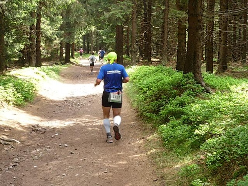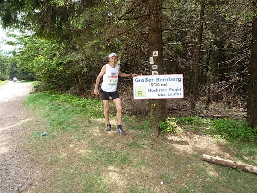 Noch immer liegen 20 Kilometer vor uns, fast ein Halbmarathon. Gleich hinter dem Grenzadler folgt der nächste kräftige Anstieg. Langsam tasten wir uns an den Kulminationspunkt unserer Strecke heran, der uns bei km 61,8 in eine Höhe von 973 m üNN, knapp unterhalb Gipfels des großen Beerbergs (982 m), dem höchsten Punkt des Thüringer Waldes, führt. "Plänckners Aussicht" wird dieser Punkt genannt, benannt nach dem Topografen Julius von Plänckner, der 1830 die erste Rennsteigwanderung von Blanckenstein nach Hörschel unternahm. Vielleicht hat der gute Mann vor 180 Jahren hier noch mehr gesehen. Wir sehen jedenfalls den Wald vor lauter Bäumen nicht. Dafür dürfen wir uns ab hier auf eine Aussicht ganz anderer Art freuen, eine, die die meisten wohl weitaus mehr motivieren dürfte als irgendein Panorama: Die Aussicht, dass es nun (fast) nur noch bergab geht.