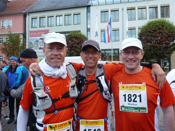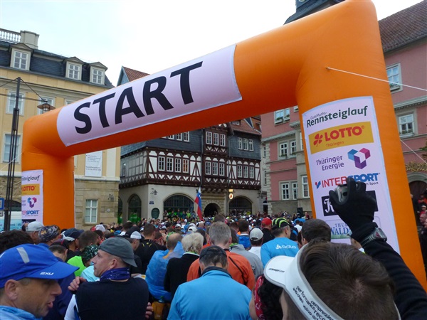 Nach dem traditionellen Abspielen des Rennsteiglieds mache ich mich mit Markus und Klaus GuthMuths (bei ihm studierte übrigens der berühmte „Turnvater Jahn“ Leibesübungen) auf den Weg. Wirklich guten Mutes, auch wenn für mich die heute zu überwindenden Entfernung sowie Höhenmeter ganz große Nummern darstellen. Aber ich habe andererseits einige ordentliche erfolgreich absolvierte Ultras als Erfahrung auf der Habenseite stehen, nicht zuletzt Röntgenlauf, K 78 und vor allem den Hunderter in Biel, die mich gelehrt haben, daß alles auszuhalten ist, wenn man das Gehirn beim Laufen nicht völlig ausschaltet und sich die Strecke vernünftig einteilt. Obwohl es Leute wie zum Beispiel meinen Freund Thorsten gibt, die hartnäckig behaupten, die 72,7 km des Rennsteiglaufs seien schwieriger zu laufen als die 100 km von Biel. Heute Nachmittag werde ich es aus eigenem Erleben bewerten können.