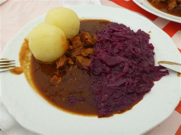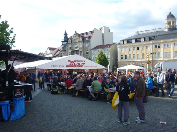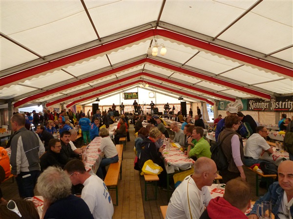 Ums Essen und Kohlehydratebunkern brauchen wir uns gar keine Gedanken zu machen, denn im Startgeld ist die Teilnahme an der einzigartigen Kloßparty inbegriffen. Ich finde es klasse, wenn das Muskelfutter regionstypisch serviert wird, man denke z.B. andernorts nur an die Kaiserschmarrenparty. Auch Nichtläufer sind für fünf Euronen dabei und Nachschlag gibt es ebenfalls. Entsprechend intensiv bemühen wir uns um die Reduzierung der reichlichen Vorräte. Im Zelt rocken lautstark die Schildkröten, weshalb wir uns zwecks Konversation nach außen begeben. Strategisch günstig sitzend gabeln wir auch noch Birgit und Norbert Fender auf (die Euch demnächst von einer ganz besonderen Veranstaltung berichten werden) und die heutige Marathon4you-Familie ist vereint. Schon früh sind wir in der Heia verschwunden, denn der Start erfolgt um sechs Uhr morgens.