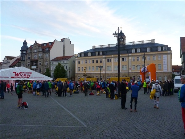 Das Aufstehen um 4:00 ist definitiv zu früh für einen Samstagmorgen, aber nichts gegen die Abfahrt um 3:30 Uhr von Schmiedefeld für diejenigen, die dort übernachtet haben, somit geht’s uns noch gut. Frühstück gibt’s lobenswerterweise ab 4:30 Uhr und nach einem ganz langsamen Fußmarsch sind wir gegen 5:45 Uhr am Start. Das Wetter verspricht kühl zu bleiben, aber ebenso trocken und darauf kommt es mir an. Erstmals teste ich Ärmlinge, die ich mir im letzten Jahr beim Davoser Nachtlauf (keine Urkunde, ich fasse es heute noch nicht) verdient habe. Sie bewähren sich, ich trage sie bis ins Ziel.