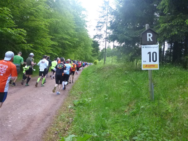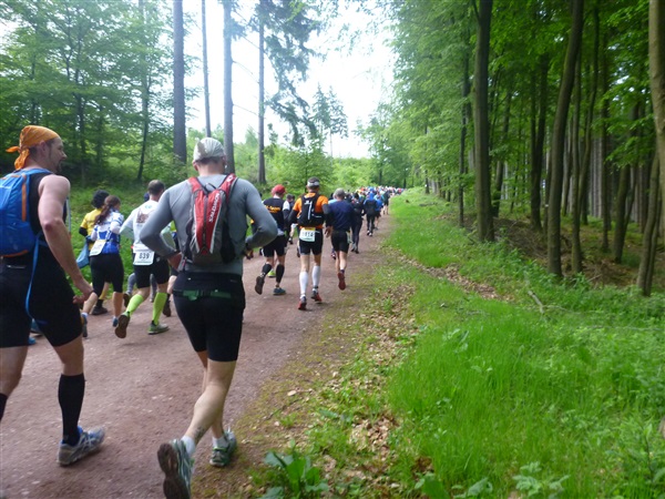 Ab jetzt im Wald unterwegs, geht es vorbei an der “Moosbacher Linde” (km 3,6 / 351 m NN) und über die Weinstraße” (km 5) zum “Marienblick” (km 6). Waren bisher alle km bis zum fünften ausgeschildert, sehen wir die Wegmarkierungen ab jetzt nur noch alle weiter 5 km. Erst die letzten beiden werden wieder einzeln ausgewiesen. Der zwischenzeitliche Stau macht mir gar nichts, denn ich gehe es ganz ruhig an. Die mit +1.470/-969 Höhenmetern gepaarten 72,7 km (mein bisher drittlängster Lauf) sind elend lang, zudem will ich in zwei Wochen bei meinem nächsten Einsatz an hochinteressanter Stelle einigermaßen vernünftig aussehen, da sollte ich heute nicht auf der allerletzten Rille ankommen.
