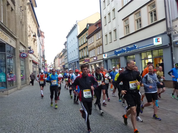 Vom Marktplatz auf 210 m NN führt uns der Weg zunächst in die Fußgängerzone durch das heute restaurierungsbedingt leider verhüllte Nikolaitor, ein freundliches Schild „Nur noch 72 km bis Schmiedefeld!“ macht wirklich Mut. Nach nur 1,5 km erreichen wir den Stadtrand von Eisenach, ein langer Anstieg von 7,4 km liegt nun vor uns. Auf der ersten Serpentine schieße ich ein schönes Foto der Läuferschar von oben, trete anschließend in ein Loch und lege mich formvollendet auf die Fr… Glück gehabt, alles noch dran und funktionsfähig.