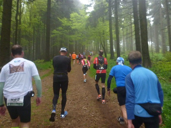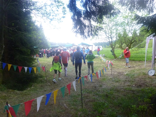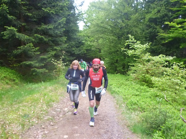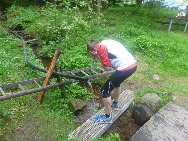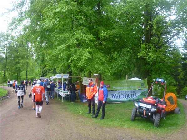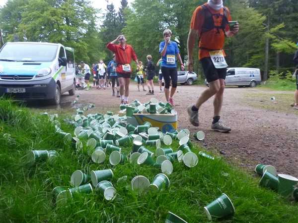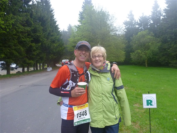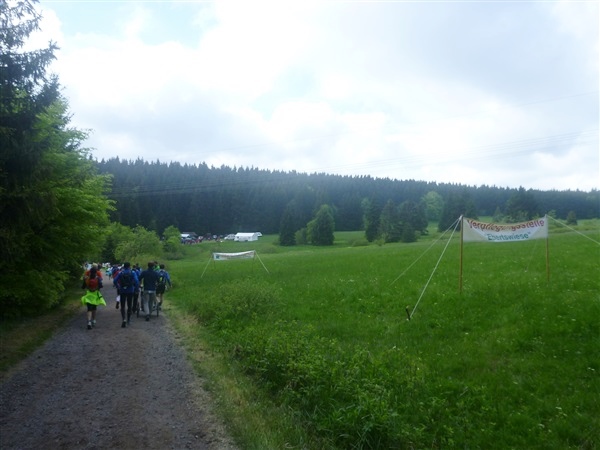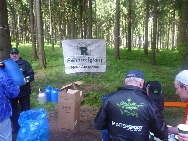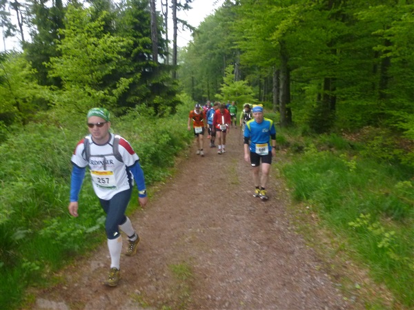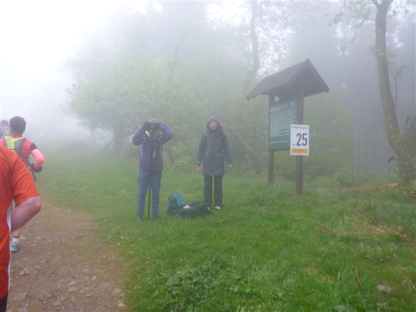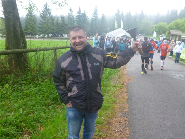 Heftig ist der Abstieg, zunächst über Treppen, dann auf festem Untergrund. Auf nur 1,3 km geht es 160 HM bergab auf 746 m NN zur Verpflegungsstelle “Grenzwiese”. Hier heißt es wieder Suppe, äh Schleim, fassen. Kurz hinter der Verpflegungsstelle steht Markus’ und meine bestellte Jubelabteilung („Ihhh, bist Du feucht!“) und so kommt auch meine heute-nicht-Läuferin zu ihrem ersten Schleimkontakt.