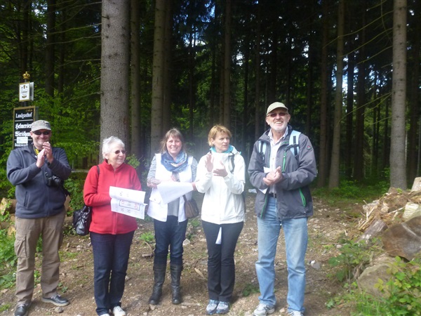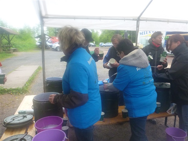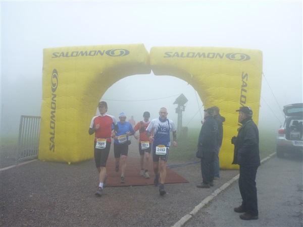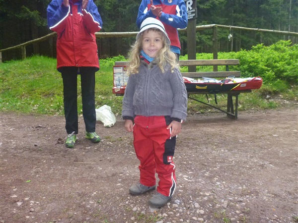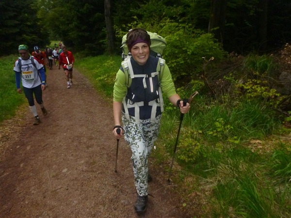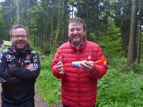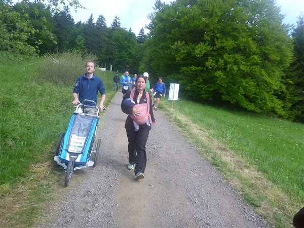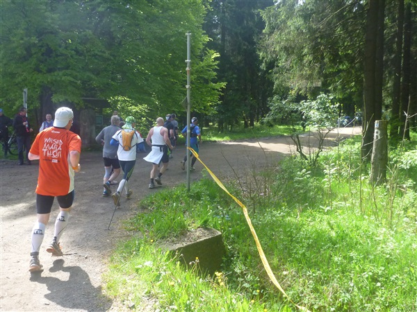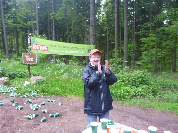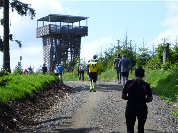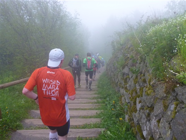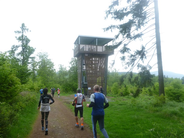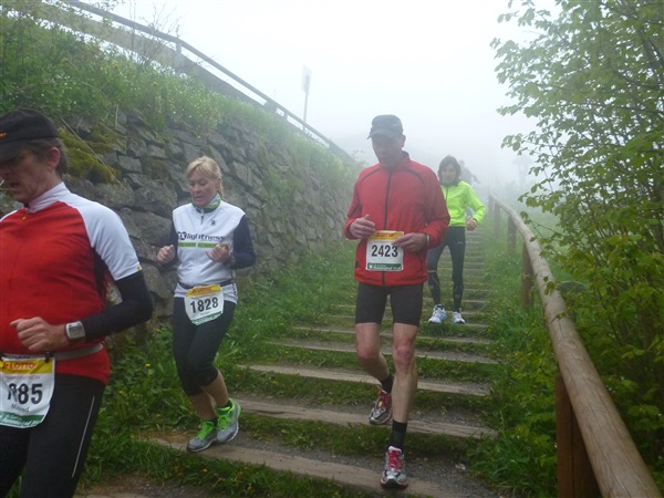 Heftig ist der Abstieg, zunächst über Treppen, dann auf festem Untergrund. Auf nur 1,3 km geht es 160 HM bergab auf 746 m NN zur Verpflegungsstelle “Grenzwiese”. Hier heißt es wieder Suppe, äh Schleim, fassen. Kurz hinter der Verpflegungsstelle steht Markus’ und meine bestellte Jubelabteilung („Ihhh, bist Du feucht!“) und so kommt auch meine heute-nicht-Läuferin zu ihrem ersten Schleimkontakt.