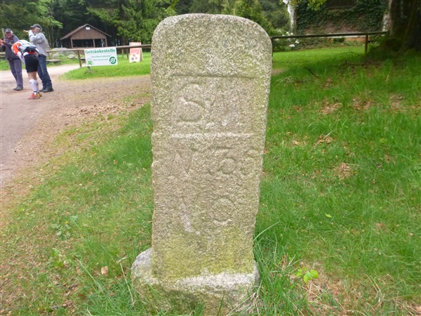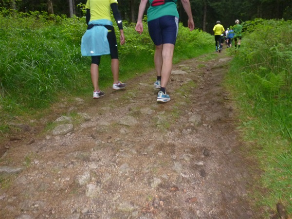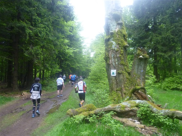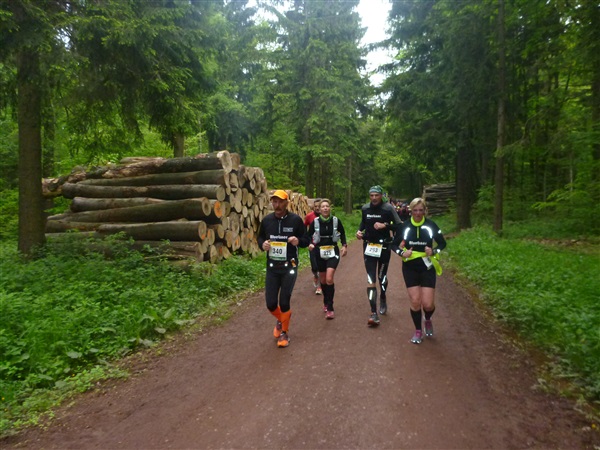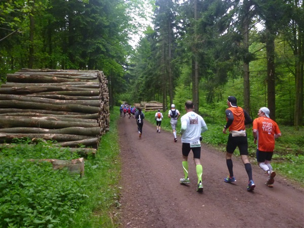 Bisher nur auf einem Zubringer unterwegs, erreichen wir den eigentlichen Rennsteig bei km 7,4 in einer Höhe von 434 m NN. Bisher weitestgehend über feste Waldwege unterwegs, komme ich gut voran, die Steigung ist moderat. Was ist das denn? Am Rand steht bereits zum zweiten Mal ein Mitläufer in Tarahumara-Sandalen und pult sich den Dreck zwischen den Zehen heraus. Ist das jetzt wirklich sinnvoll oder soll es cool wirken? Riesige Holzlager am Wegrand erfreuen den begeisterten Holzheizer in mir nur bedingt, denn die Scheite lagern dort erstens noch in Stammform und zweitens gehören sie mir nicht. Die zuhause gehabt, ich hätte ausgesorgt.
