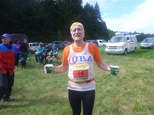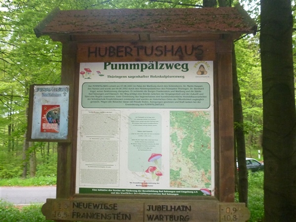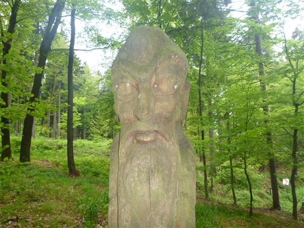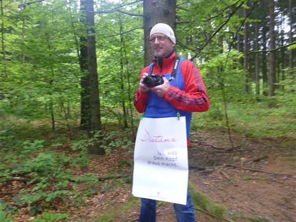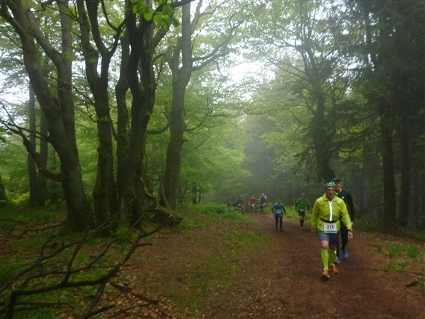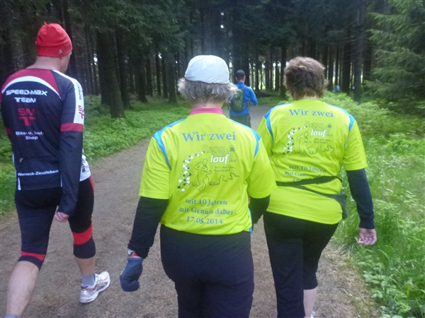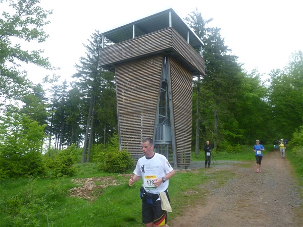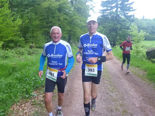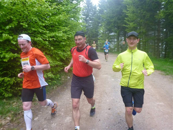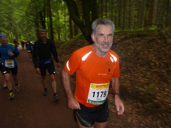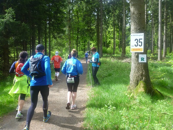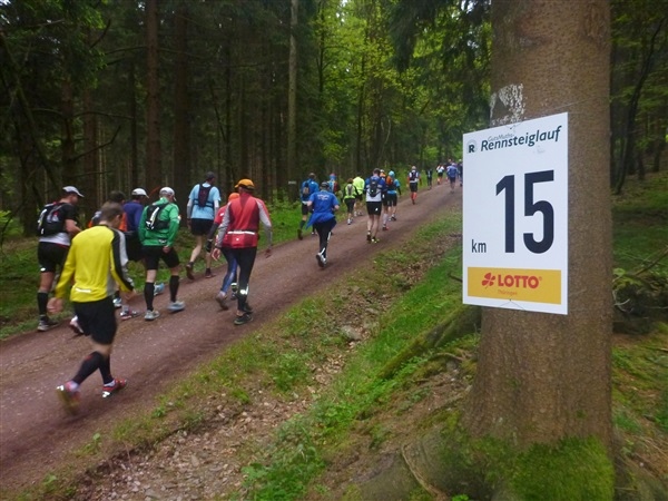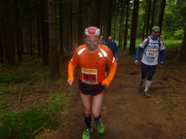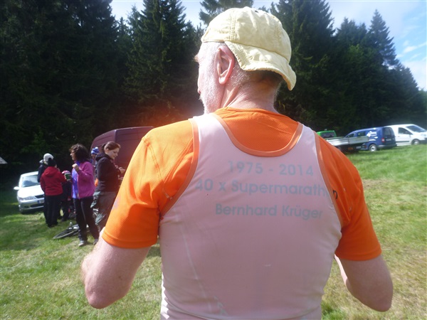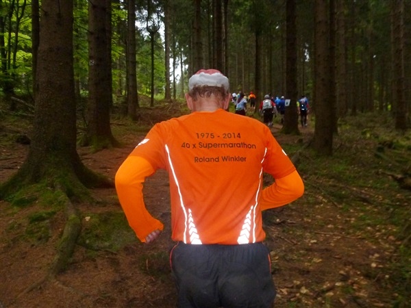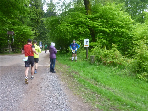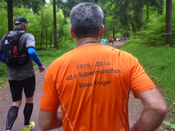 Auf dem Pummpälzweg, benannt nach einem Kobold aus der Thüringer Sagenwelt, etwa 30 Holzskulpturen schmücken ihn auf jedem seiner km, überwinden wir etliche weitere Höhenmeter. Markus macht mich auf einen Läufer aufmerksam, der ein Shirt mit einem besonderen Aufdruck trägt: „40 x Supermarathon“. Wahnsinn, Klaus Krüger läuft ihn heute seit 1975 tatsächlich zum vierzigsten Mal, einfach unglaublich. Und ein netter Kerl ist er dazu. „Du weißt schon, daß das ein Wettkampf ist!“, meint er augenzwinkernd, als ich ihm ein kurzes Gespräch aufs Ohr drücke. Drei weitere seiner „Kollegen“ werde ich heute noch bemerken und vor die Linse bekommen. Was für eine Gnade, so lange so verletzungsfrei so weit laufen zu können! Georg Hilden spricht mich an, er ist heute mit Peter Wedelgaß unterwegs. Natürlich, letztens waren wir noch gemeinsam beim Rheinsteig-Erlebnislauf unterwegs! Ich schätze diese netten, unverhofften Wiedersehen sehr.