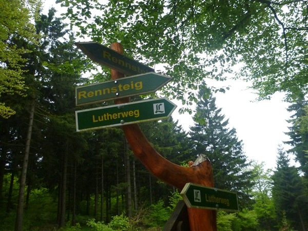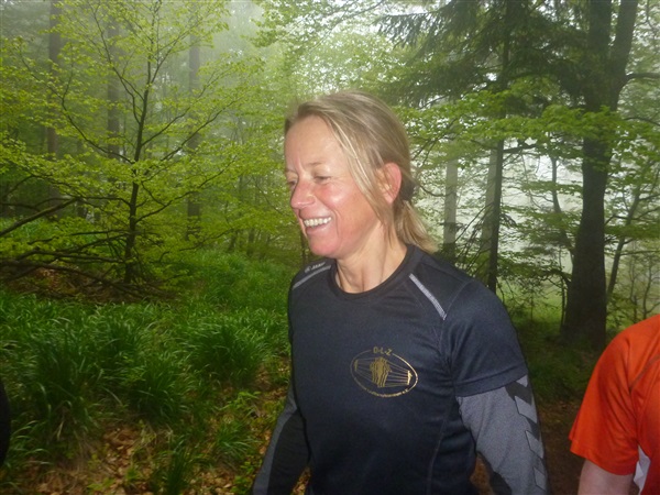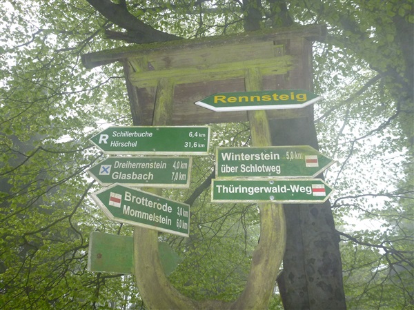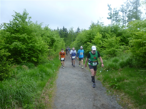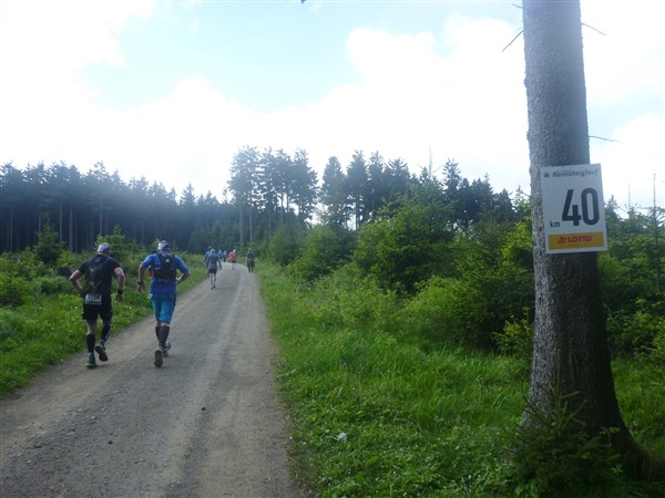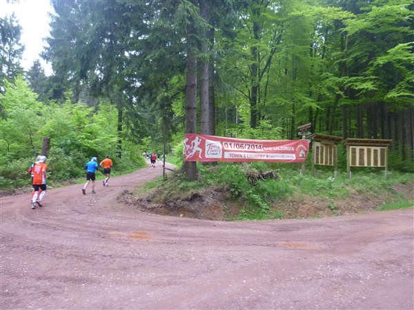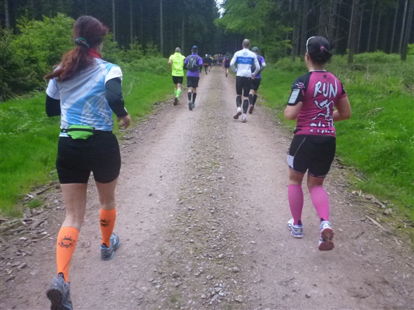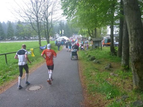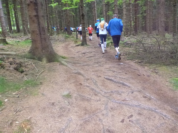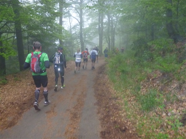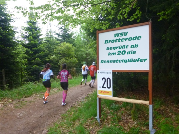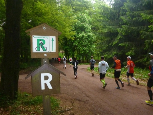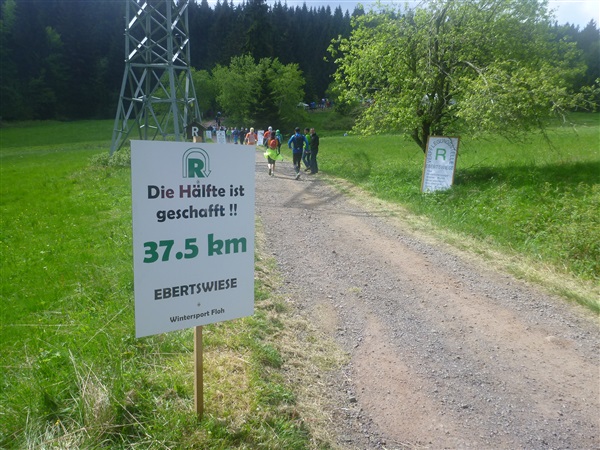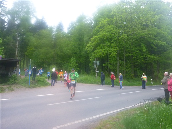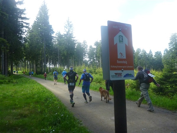 Gedanklich habe ich mir die heutige Strecke in drei, allerdings sehr unterschiedliche Abschnitte aufgeteilt. Auf den ersten 25 km bis zum Großen Inselsberg warten die meisten Anstiege. Insbesondere beabsichtige ich zurückhaltend zu laufen, sonst drohen die restlichen zwei Drittel brutal zu werden. Ganz Gemach, es ist doch auch kein Renn-Steig. Außerdem werden wir hier erstmals durch unsere Fans erwartet, da empfiehlt es sich noch einigermaßen entspannt auszusehen. Das 37 km lange Mittelstück des Kurses verspricht häufiger auch mal flache Abschnitte, bevor wir nach insgesamt 62 Kilometern den Großen Beerberg als höchsten Punkt der Strecke erreichen. Danach warten noch 10 überwiegend abfallende km, durch zwei knackige Steigungen garniert, auf uns.