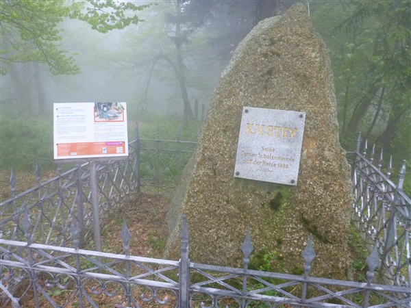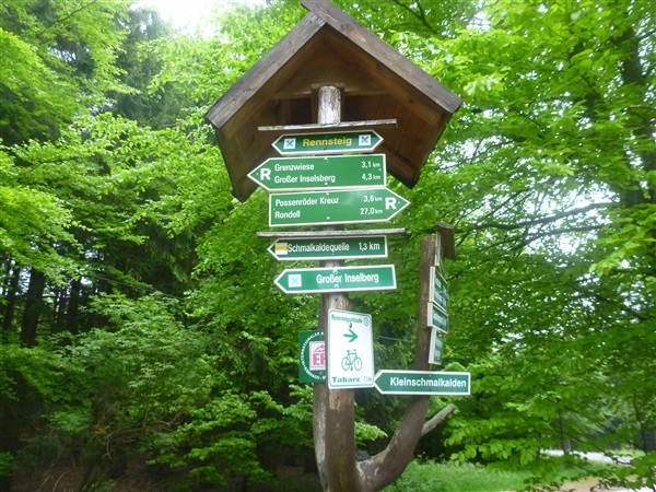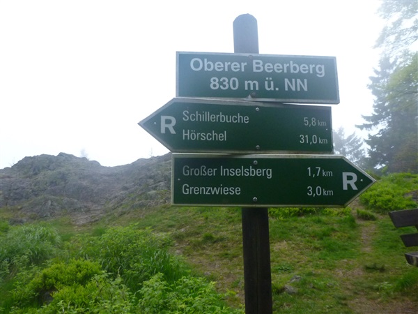 830 Höhenmeter sind kurz unterhalb des Oberen Beerbergs (km 24 / 841 m NN) erreicht. An normalen Tagen hat man von dort bestimmt eine schöne Aussicht, ich schenke mir heute den Abbieger, es hat sich völlig zugezogen. Ein markantes Zwischenziel ist mit dem Inselsberg (km 25,5 / 916 m NN) erreicht. Angeblich soll man hier Türme sehen können, heute aber bestenfalls ganz schemenhaft, jeder Fotografierversuch wäre völlig sinnlos. Genau so kenne ich es vom Brocken.
