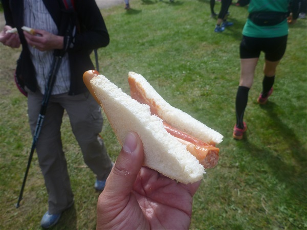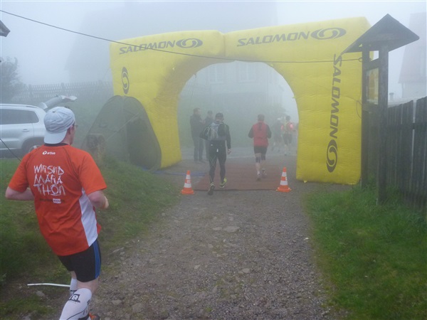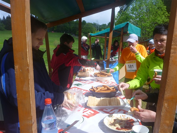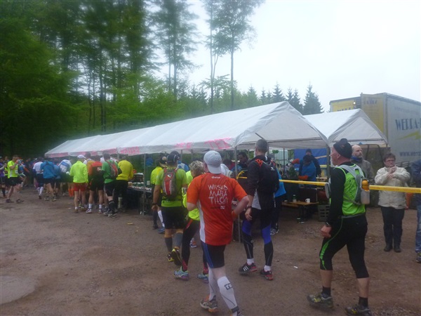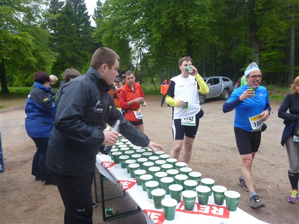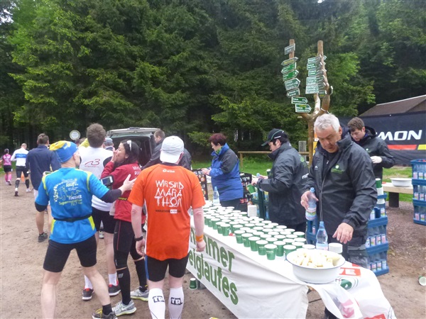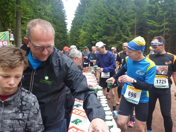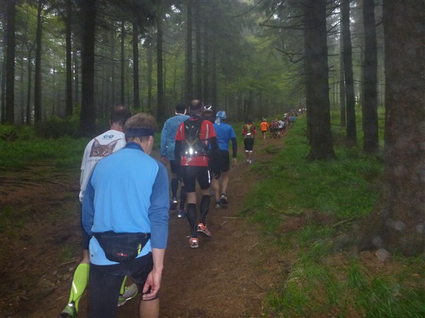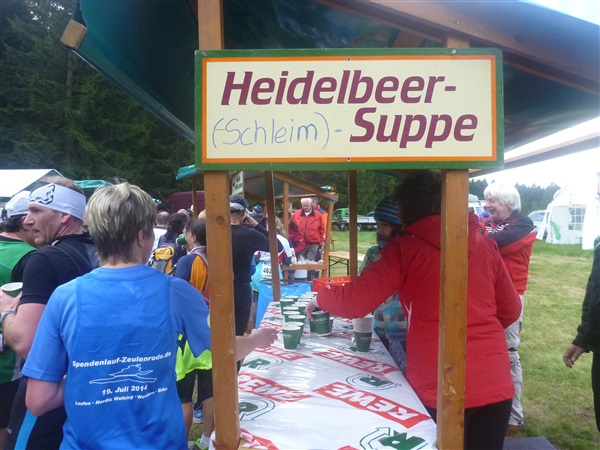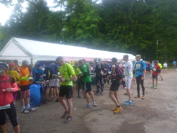 Weiter merklich aufwärts geht es über die Bergwachthütte (km 15) zur ersten Verpflegungsstelle “Glasbachwiese” bei km 18 / 647 m NN). Erfahrene wissen, was jetzt kommt, Neulinge passen auf: Der Schleim. Wem bei dieser nicht ganz passenden Bezeichnung nicht schon schlecht geworden ist, muß ihn ausprobieren. Der flüssige, warme Art Haferbrei in verschiedenen Geschmacksrichtungen (am Brocken erstmals kennengelernt) ist wirklich der Hit, für mich als bekennenden Eintopfjunky, Milchreis- und auch Grießbreiesser gerade in der Version Heidelbeere (mit jeder Menge ganzer Früchte) hervorragend. Unter zwei Bechern verlasse ich keinen Stand mehr. Das übrige Angebot ist umwerfend.