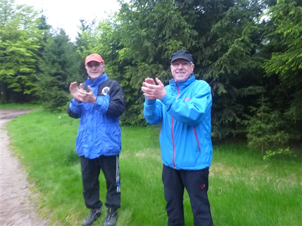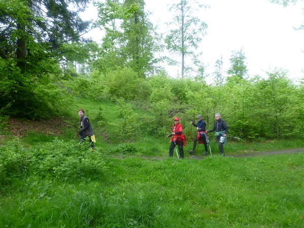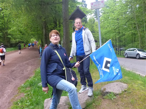 Wir kommen bei km 13 / 570 m NN zur Getränkestelle “Ascherbrück”, an der ich auf Tee umsteige. Das Wasser ist mir zu kalt, außerdem mag ich unterwegs keine Kohlensäure. Zwei unentwegte fahnenschwingende HSV-Fans begrüße ich vor dem morgigen entscheidenden Relegationsspiel gegen Greuther Fürth mit einem einfühlsamen „Na, ihr Zweitligisten!“, aber sie lachen nur und wir wissen ja: Wer zuletzt lacht, lacht am besten. Ist für die Hanseaten ja gut gegangen.