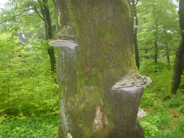 Es wird immer diesiger, das Kameraobjektiv beschlägt, was ich aber dummerweise erst zuhause bemerke. Beeindruckende Baumformationen erfreuen mein Auge, wer behauptet da, Wald wäre langweilig? Hier steht doch Naturgenuß an, dann sollte man auch die Unterschiede wahrzunehmen versuchen. Ich glaube, heutzutage können die meisten Menschen mehr Automarken aufsagen als unterschiedliche Bäume benennen.