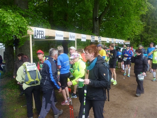 Das erste Mal Getränke gibt’s am “Waldsportplatz” (km 7) und ich glaube erst nicht, meinen Augen trauen zu können: Erster Wasserstand leer, zweiter leer, dritte leer. Aber ich finde dann hinter dem Tee doch noch etwas und muß mich nicht schon jetzt auf Iso oder Cola einlassen. Sogar Obst hätte man jetzt schon bunkern können! Ihr seht bereits schon und werdet es später noch häufiger bemerken: Das Angebot ist Bombe!