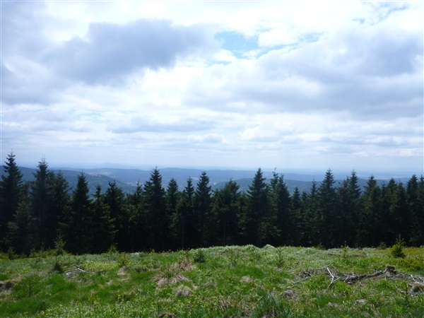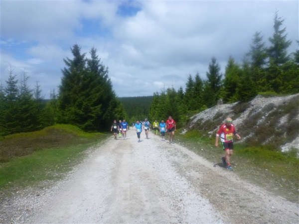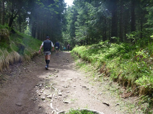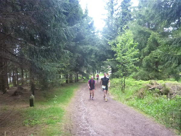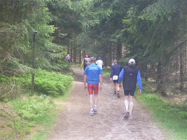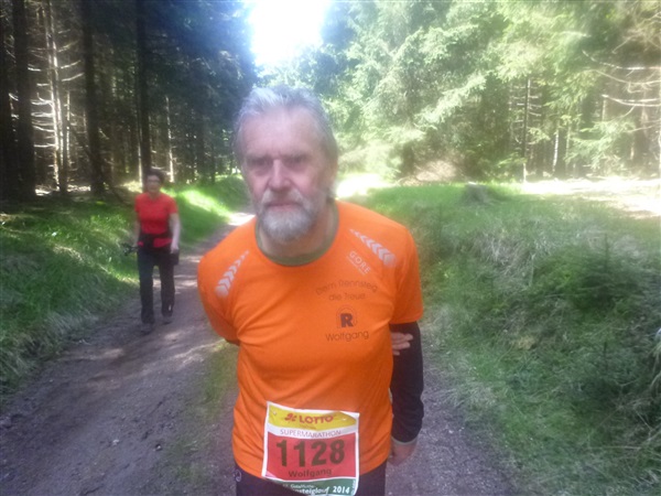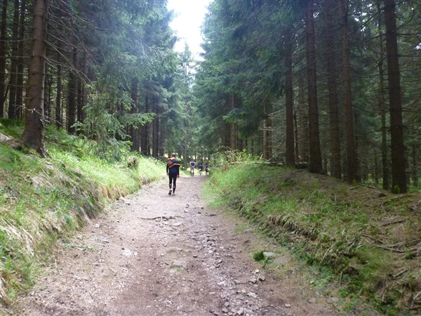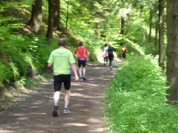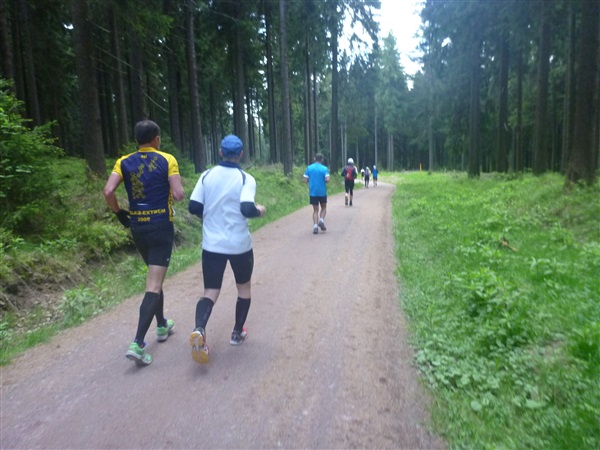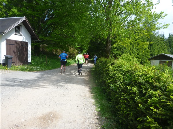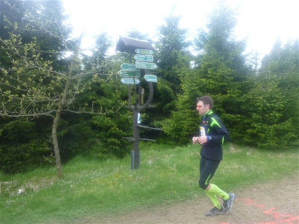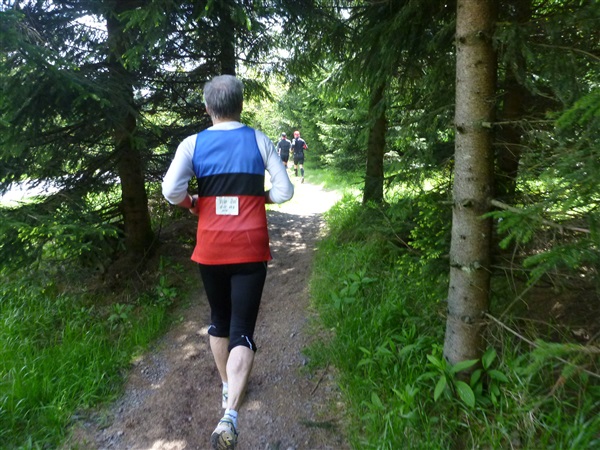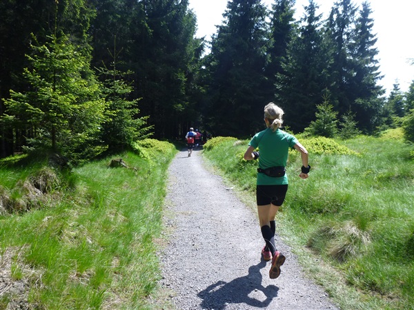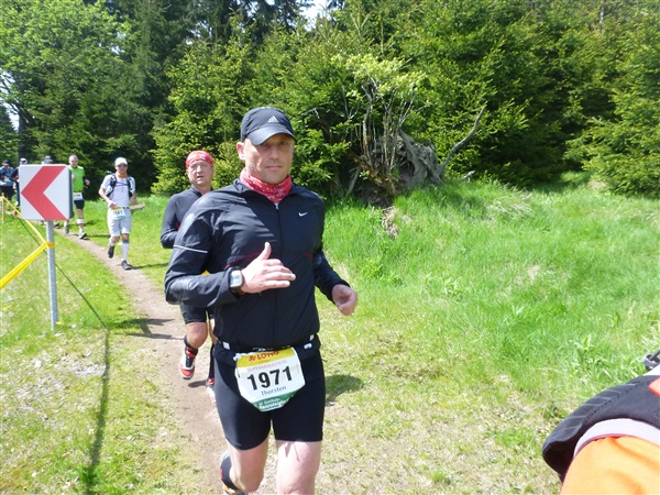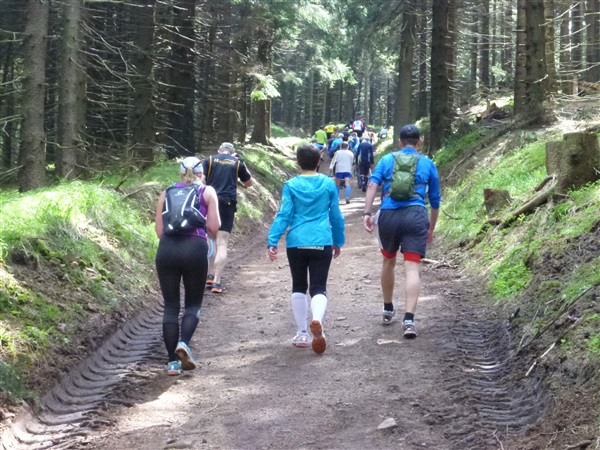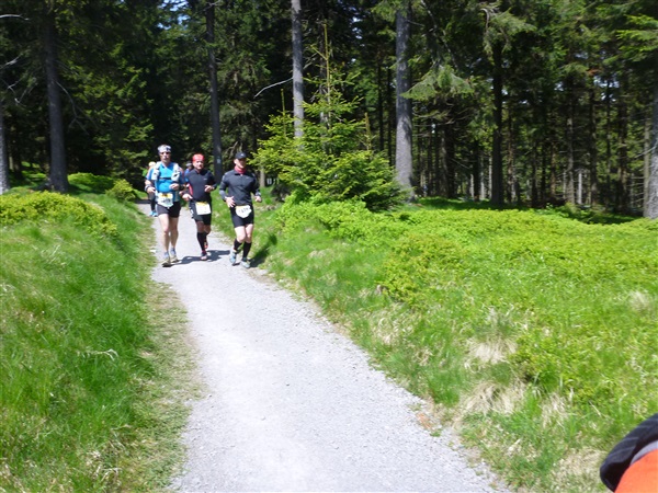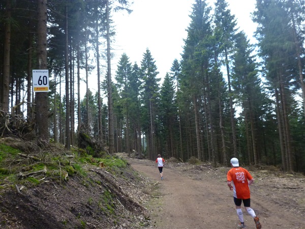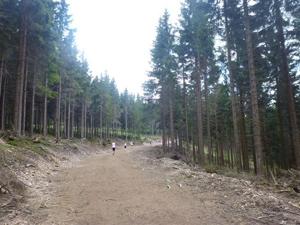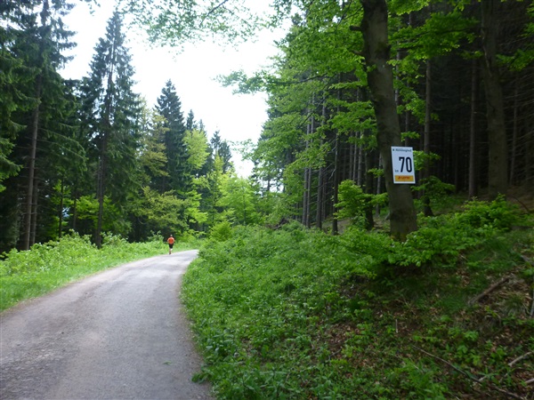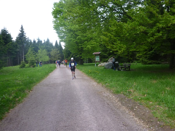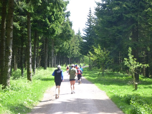 Zufrieden ziehe ich nach diesem Gaumensex gut genährt weiter. Mittlerweile lugt ab und an die Sonne hinter Wolkenlücken hervor und wärmt Körper und Seele. Jetzt ist es schade, im Wald zu laufen, der nur gelegentlich sein grünes Dach öffnet. Km 40 auf rund 760 m NN naht und damit eine für einen Marathon höchst wünschenswerte Zahl, heute jedoch liegt an dieser Stelle noch ein veritabler „Langer“ zwischen hier und dem Ziel. Die Spuren von Kyrill beginnen langsam zu verschwinden, die Schneisen, die der Orkan 2007 geschlagen hat, beginnen wieder zuzuwachsen.