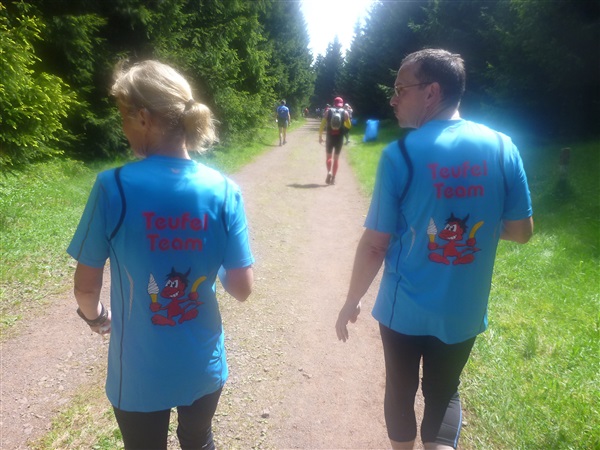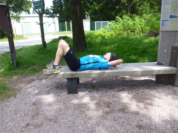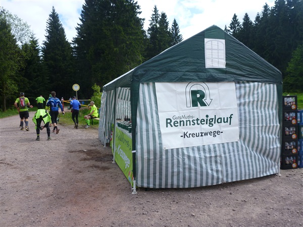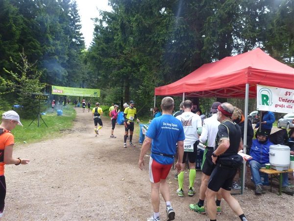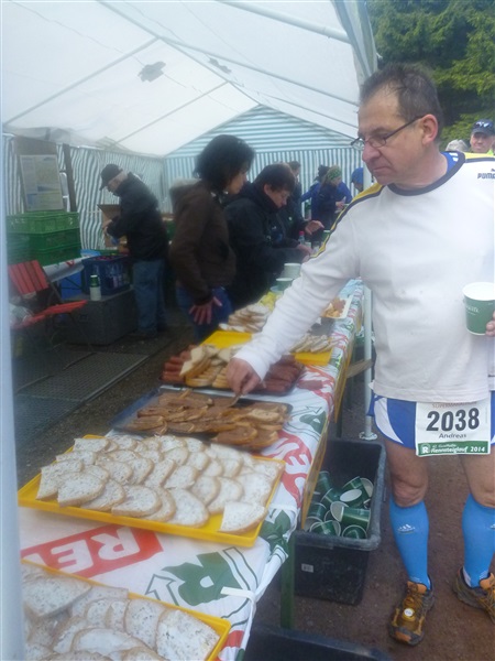 Die übernächste Verpflegungsstation ist die “Ebertswiese” (km 37,5 / 715 m NN), mit der gut die Hälfte der Strecke geschafft ist. Ich schwelge im wiederum reichhaltigen Angebot und bin begeistert über die Wiener Würstchen (warm). Ich lege jegliche Hemmung ab und verdrücke umgehend solch ein Teil mit Toast, Senf und Ketchup. Das ist keine Läufernahrung, sagst Du? Mir doch egal!