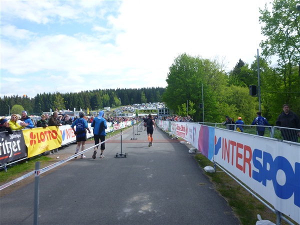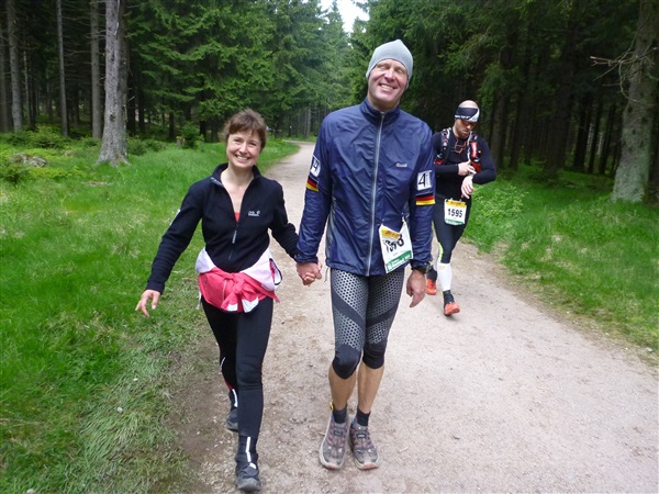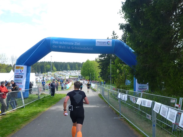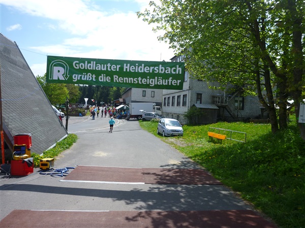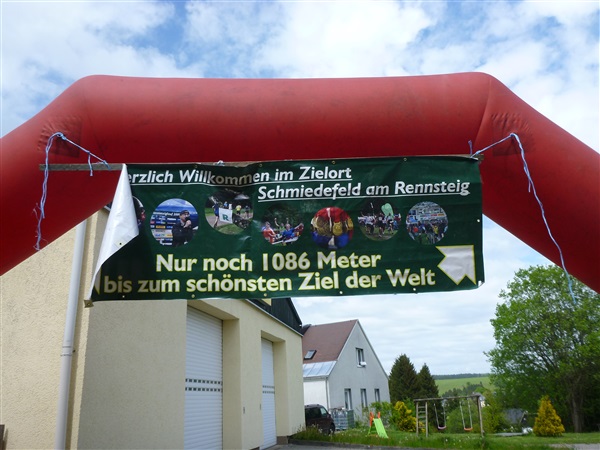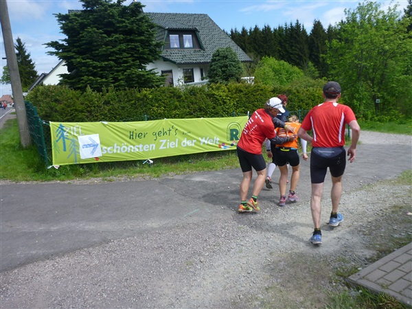 Dermaßen für das letzte Stück noch einmal mit Energie versehen, ist das Ziel nicht mehr weit. Wohl aber das km 70-Schild. Wo ist dieses Sch…öne Teil? Links unter mir breitet sich schon Schmiedefeld aus, so weit kann das doch nicht mehr sein? Na gut, dann hängt halt keines oder ich habe es übersehen, immerhin habe ich ja seit dem 60er-Schild einen km weniger auf dem Tacho. Dann, als ich schon auf den Sportplatz spekuliere, kommt es endlich. Die sehr zuverlässige Suunto zeigt 70,9 und springt sofort auf 71. Erst einen km zu wenig, zehn km später einer zu viel? Aber egal, das ist mir doch so was von Conchita! „Noch 1.086 m bis zum schönsten Zeil der Welt“, heißt es jetzt. Ich sage Euch ehrlich – das bleibt aber unter uns – mir ist nach einem langen Lauf JEDES Ziel das schönste der Welt. Aber dieses ist hier und heute einzigartig und deshalb freue ich mich ganz besonders darauf.
