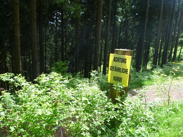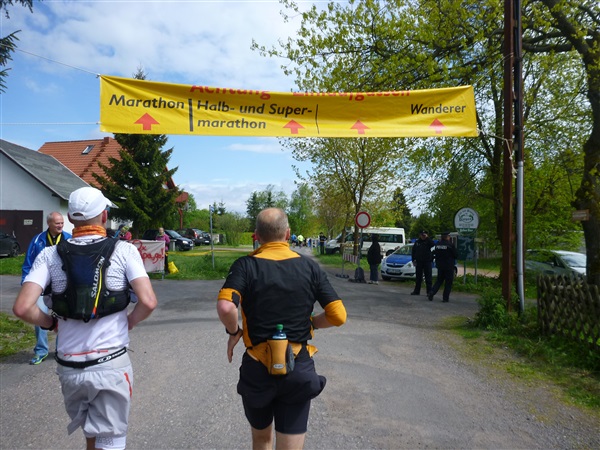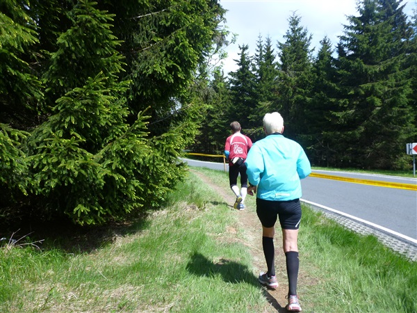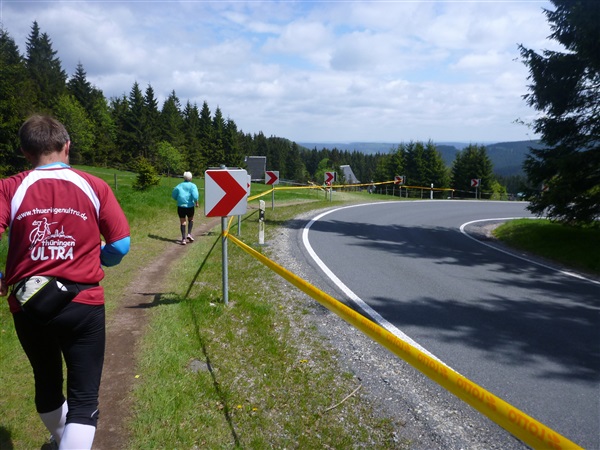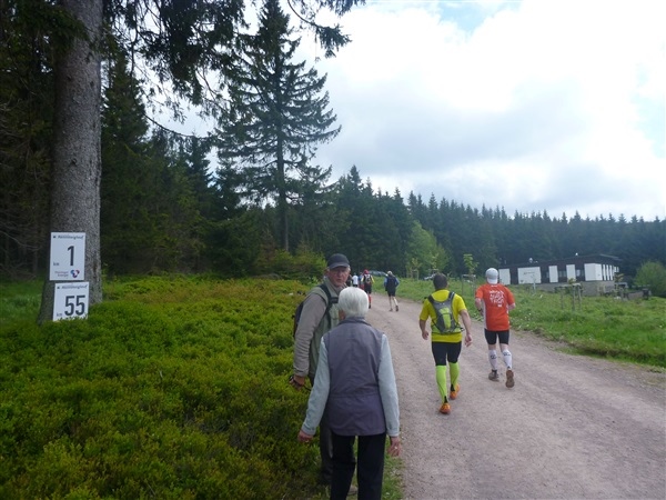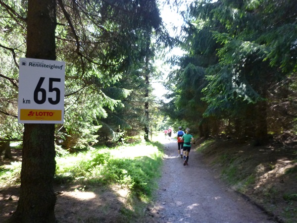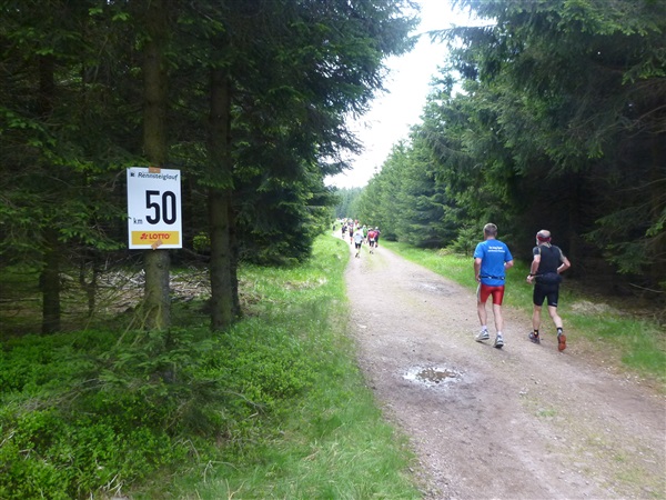 Ab dem km 55-Schild geht es parallel wieder mit der „1“ los, die gilt für die Läufer des Halbmarathons, die hier schon heute Morgen durchgezogen sind, aber bis Schmiedefeld noch eine kleine Zusatzrunde absolvieren müssen. Gott sei Dank sind wir wenigstens diese Nahrungskonkurrenten schon mal los.