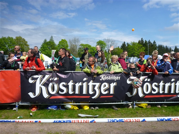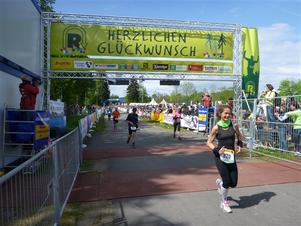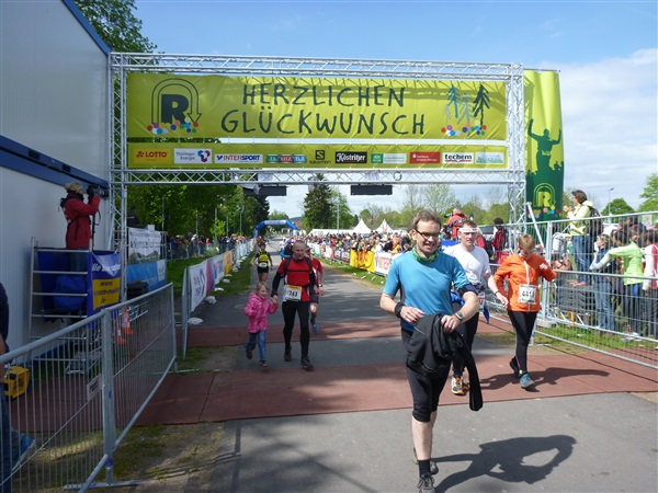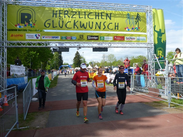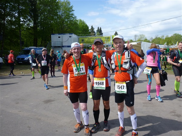 Markus und Klaus sind wenige Minuten zuvor eingetroffen, so nehmen wir die finalen Schritte zusammen in Angriff: Medaillenempfang, Gemeinsames Heldenfoto, Bier trinken (Gutschein), Stützstrümpfe ausziehen (Krampf, Kacke), Duschen (warm, perfekt!), Suppe essen (Gutschein), die Frauen vereinnahmen und viel Läuferlatein erzählen. Dann tun wir etwas, für das uns manche steinigen würden: Wir schwänzen die Abschlußparty, fahren nach Eisenach zurück, gehen lecker essen und schauen uns gemütlich mit hochgelegten Füßen das DFB-Pokalendspiel an. Die Bayern gewinnen 2:0. Der einzige gravierende Makel eines perfekten Tages.