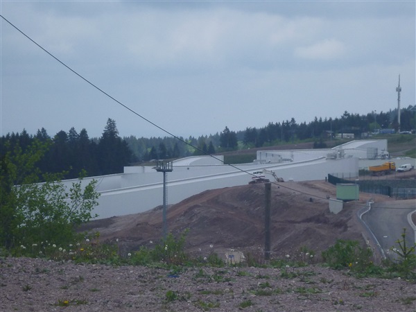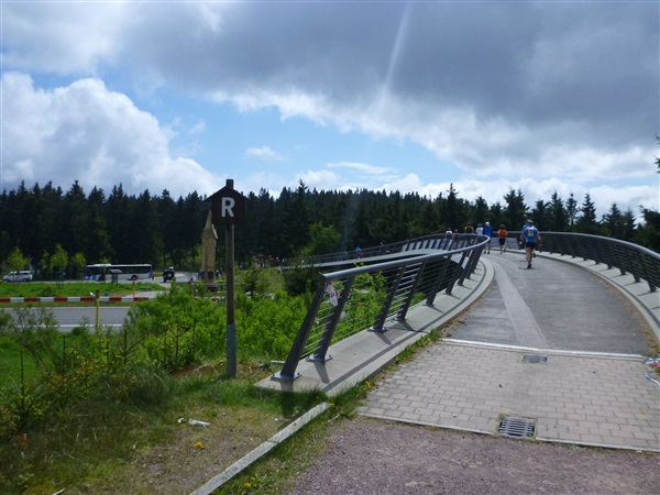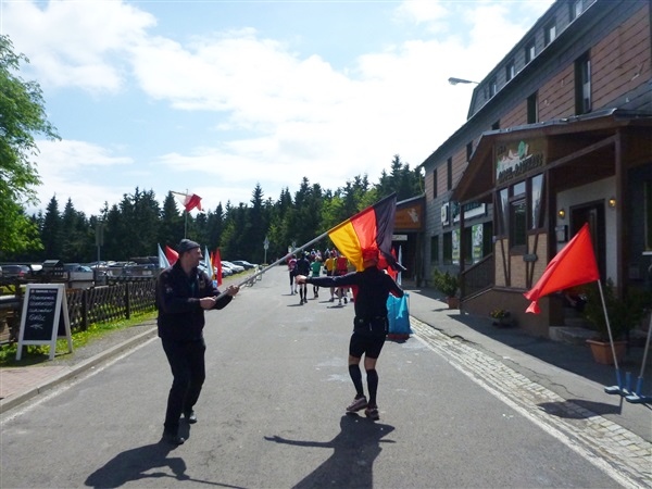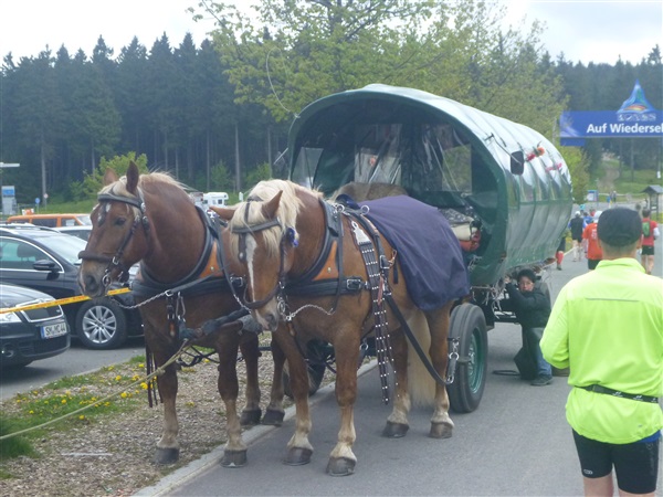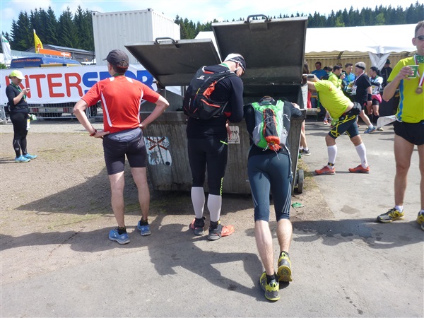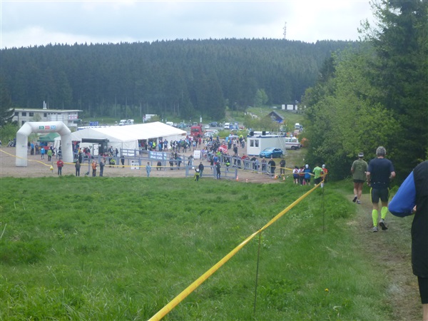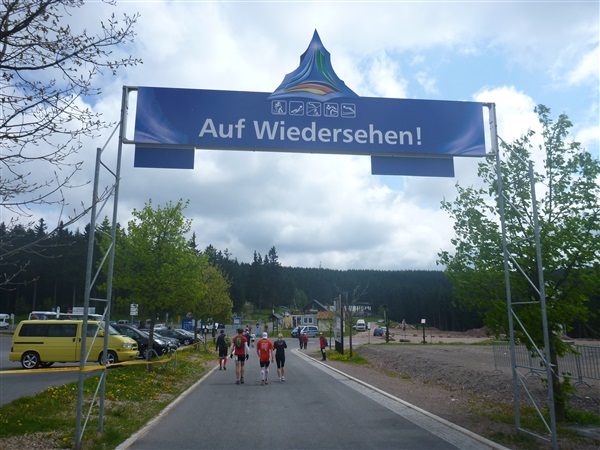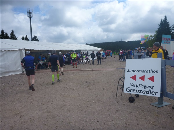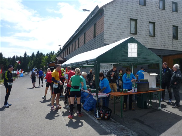 Bei km 54,2 ist der “Grenzadler” (837 m NN) bei Oberhof und damit die nächste Verpflegungsstation erreicht. Leider habe ich nur Augen für das wiederum reichhaltige Angebot und das Biathlonstadion, zudem stoße ich auf Klaus und seine Freunde, die hier auf ihn warten. Somit verpasse ich zu meinem späteren Bedauern den Grenzstein, den die Preußen seligen Angedenkens zur Markierung ihres Herrschaftsanspruchs nicht nur hier aufzustellen pflegten. Wer nicht mehr weiter kann, hat hier (die einzige) offizielle Ausstiegsmöglichkeit mit Wertung.