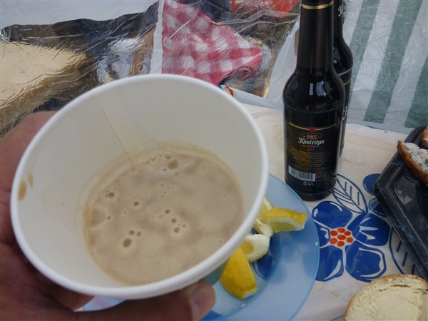 An der letzten Verpflegungsstelle “Schmücke” (km 64 / 916 m) nehme ich nochmals das volle Programm auf und die abschließenden acht km unter die Füße. Dachte ich. Immer weiter abwärts winkt, hundert Meter tiefer, an km 68 die letzte Getränkestelle “Kreuzwege” auch “Bierfleck” genannt. Dank Markus bin ich vorbereitet, denn hier erhält man, dem Namen entsprechend, einen (nicht zu üppig) gefüllten Becher Köstritzer Schwarzbier. OK, das mit dem Bier unterwegs ist nicht unbedingt mein Ding, aber die Veranstalter wappnen sich ja heutzutage mit größeren Biervorräten, wenn es heißt, Marathon4you naht. Und da unser Protagonist nicht vor Ort ist und auch der Anton nicht immer überall sein kann, bin ich tapfer und trete in große Fußstapfen. Man gönnt sich ja sonst nichts!