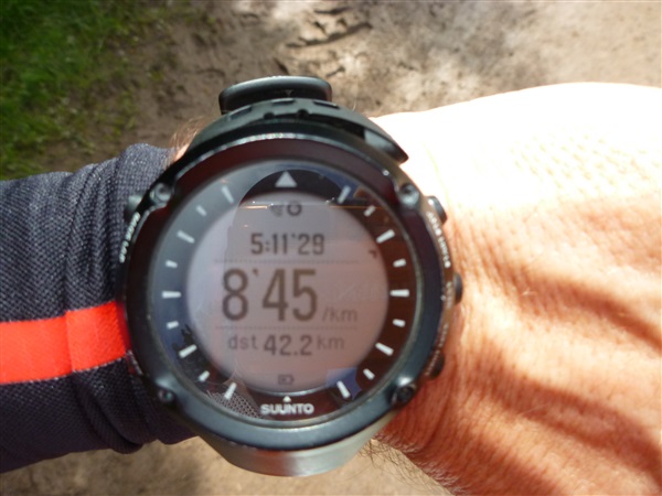 Nach der Getränkestelle “Sommerswiese” (855 m NN) überqueren wir die Straße und ich komme ins Schleudern. Hatte die Entfernungsangabe meiner Suunto mit der an der Getränkstelle vermerkten km-Angabe (52,25) noch exakt übereingestimmt, kommt km 60 kurz vor der “Suhler Ausspanne” (922 m HH) exakt einen km zu früh. Nanu? Hier werden wir gegenüber dem üblichen Kurs anders geleitet, möglicherweise ist die Abweichung dadurch zu erklären.