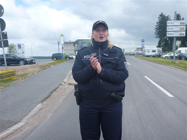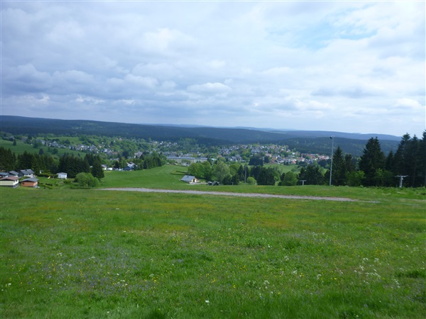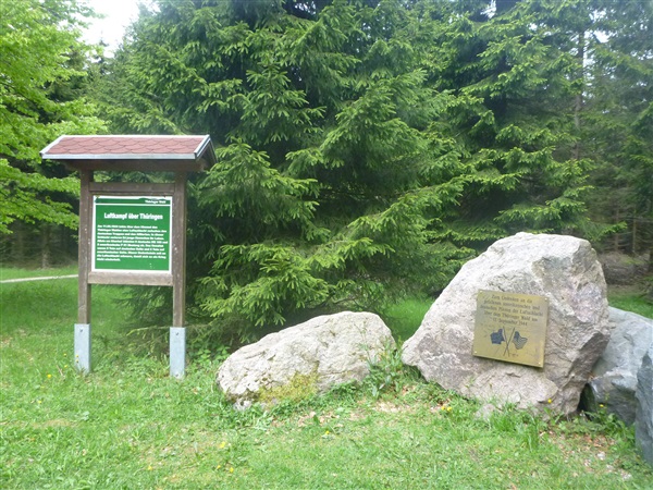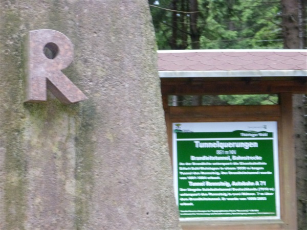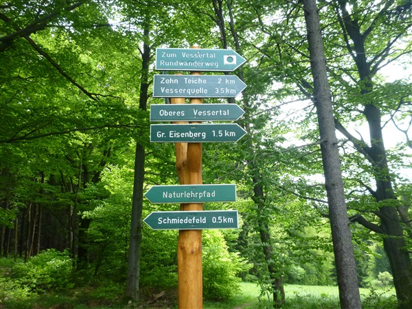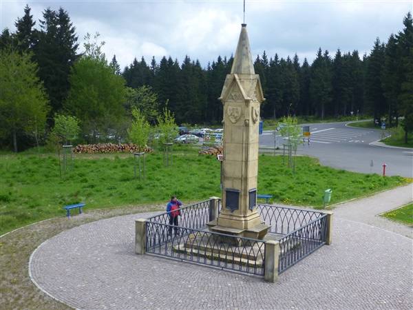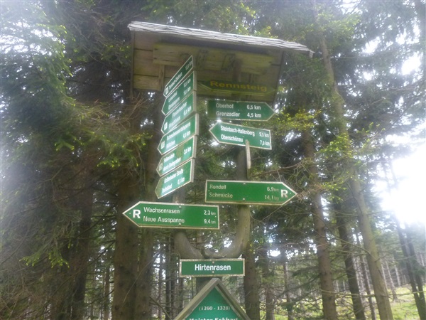 Bergab läßt der Dunst endlich etwas nach, die Sicht wird wieder besser. Glücklicherweise ist und bleibt es auch bis zum Ende trocken, allerdings läßt die Temperatur, insbesondere auf den Höhen, doch zu wünschen übrig. Meine Ärmlinge werde ich erst vor dem Duschen ablegen. Ein weiteres markantes Zwischenziel, die Grenzwiese, rückt näher. Zwischenzeitlich sind die Wanderer auf ihren 35 km von Schnepfenthal bis zum Grenzadler nach Oberhof zeitgleich mit uns unterwegs.