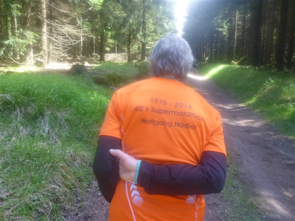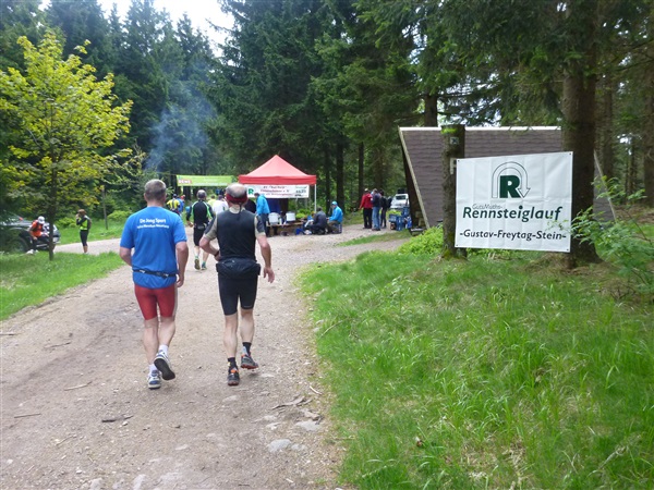 Ein weiterer 40 x Supermarathon-Held, Wolfgang Nadler, fragt mich nach Magnesium. Wer diesen Vornamen trägt, kann kein schlechter Mensch sein und hätte das Gewünschte auch sofort erhalten, nur habe ich zu meinem Bedauern keines dabei und kann ihm nur ein Gel anbieten. Mit km 50 ist eine weitere markante Wegstrecke absolviert, beim Albmarathon hätte ich es jetzt geschafft. Kurz darauf kann am “Gustav-Freytag-Stein” wieder nachgetankt werden.