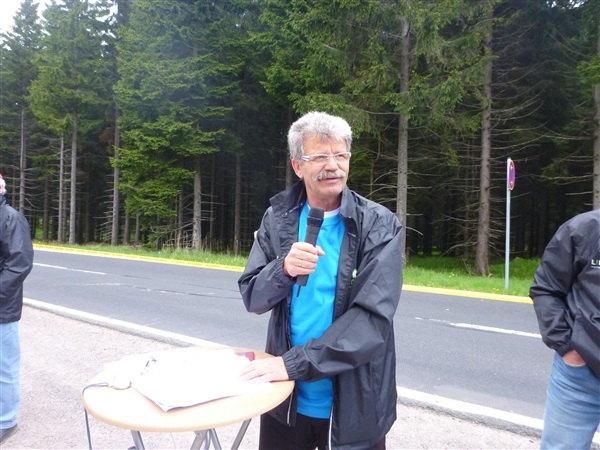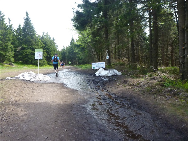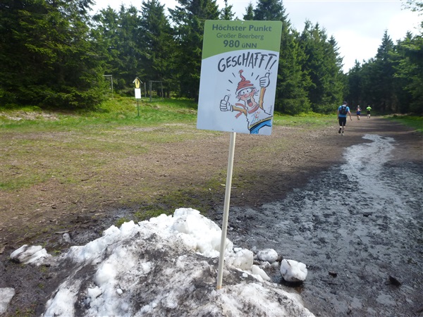 Dann ist plötzlich jede Menge Wasser auf dem Weg, das uns entgegenfließt. Wo kommt das denn bei blauem Himmel her? Und was ist das Weiße am höchsten Punkt der Strecke, “Plänckners Aussicht” (km 62 / 973 m NN), unterhalb des Gipfels des Großen Beerberges? Da hat man hier doch tatsächlich jede Menge Schnee aus der Eishalle abgekippt, um diesen markanten Punkt stilecht zu garnieren. Tolle Idee, die selbst für das hintere Feld noch einigermaßen Bestand hat!