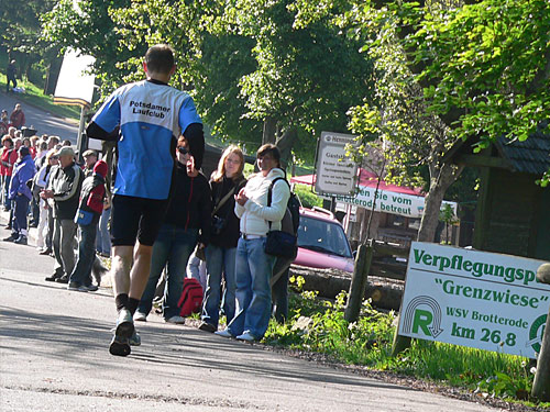 Nach ca. 45 km erreicht man die Neuhöfer Wiese. Eine weitere Verpflegungsstelle steht für uns bereit. Auf der Neuhöfer Wiese war bis ins 19. Jahrhundert ein Viehhof gelegen. Der Weg verläuft weiter bergauf und bergab. Ich unterhalte mich mit einem Läufer aus Hamburg, der mir doch tatsächlich erzählt, er hätte nicht gewusst, wie viele Berge der Thüringer Wald hat. Schon interessant, wie „vorbereitet“ manche Läufer an so eine Strecke gehen. Die Laufberichte bei marathon4you kennt halt doch nicht jeder.