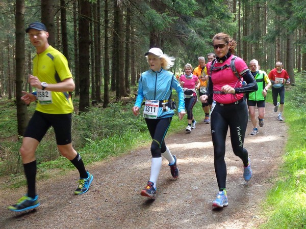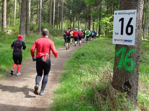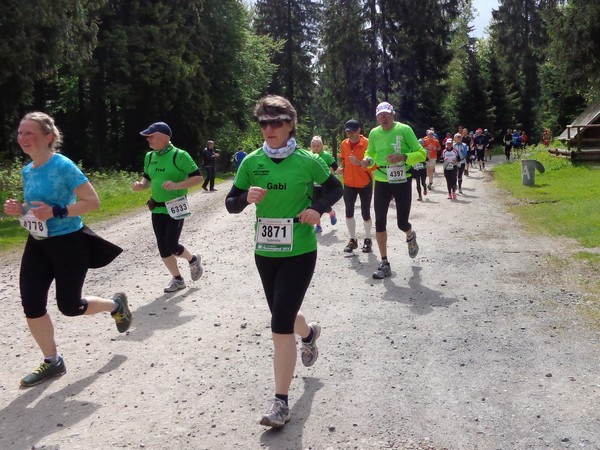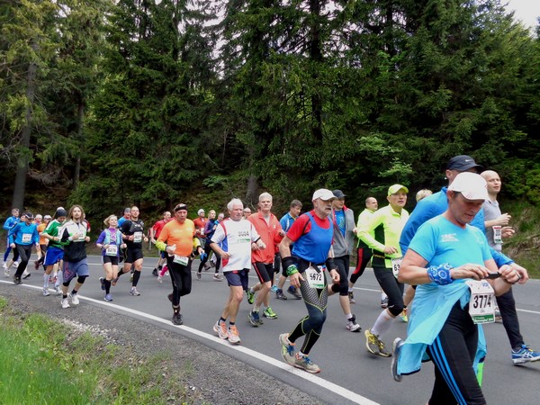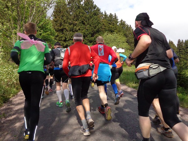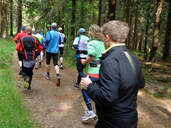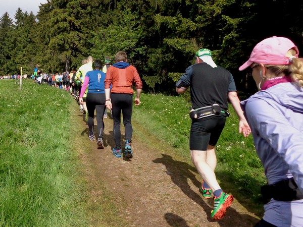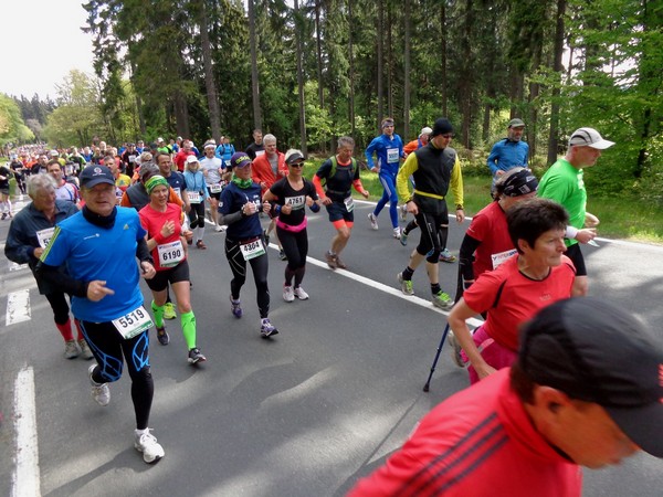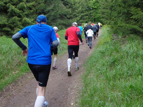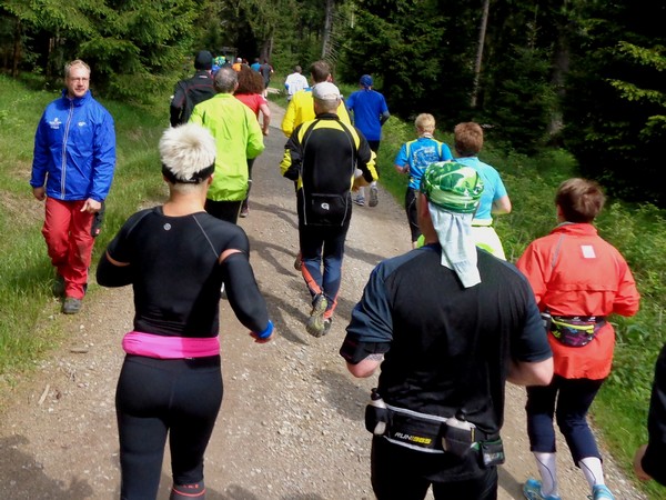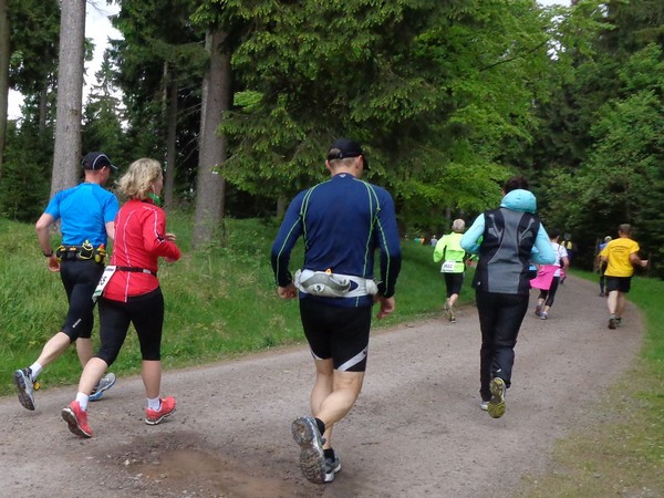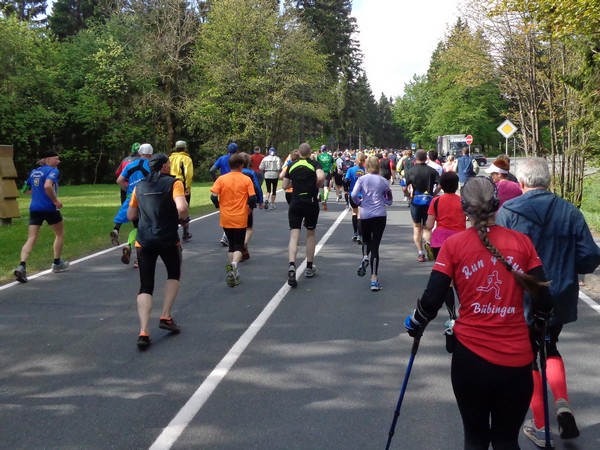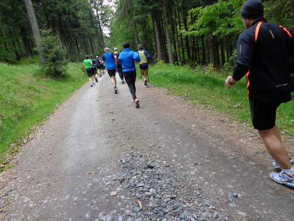 Die Sonne im Rücken geht es nun für weitere 2km mehr oder weniger flach dahin, bevor wir Höhenmeter verlieren. Auf dem schönen Asphalt können wir flott drauflos laufen, links und rechts Wald, in weitem Bogen geht es bergab. Ich mache ein paar Fotos, jetzt sieht sicher jeder noch frisch aus. Von weitem höre ich den Sprecher der ersten Getränkestelle. „Bereits 5,81km habt ihr geschafft, der Rest ist ein Katzensprung!“